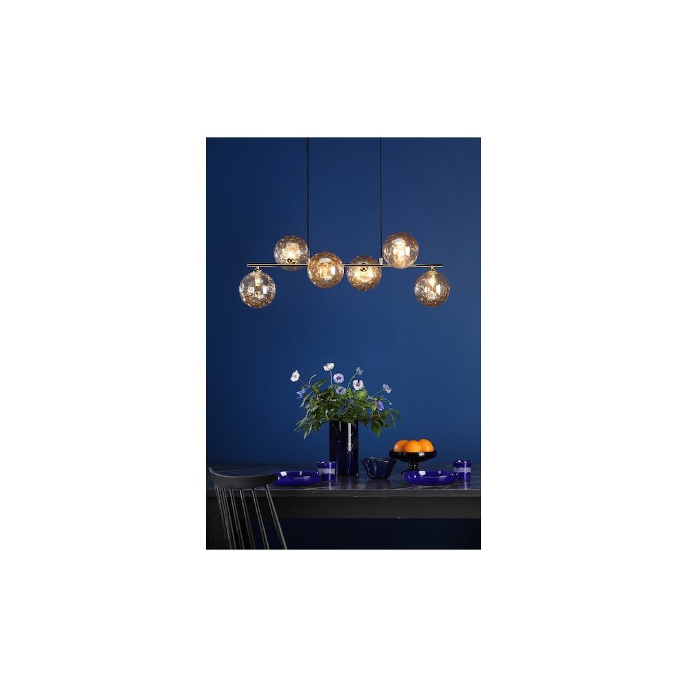 This elegant lighting fixture, the Dar SPI6435-11 Spiral 6 Light Bar Pendant, showcases a beautiful matte gold finish paired with champagne dimpled glass. Its sophisticated design provides a luxurious ambiance to any room, perfect for creating a warm and inviting atmosphere.
