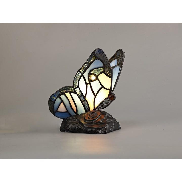 This stunning collection of traditional butterfly table lamps are available in multiple colours and wing shapes in natural reflection of the living creatures. Created from classic Tiffany glass shapes and patterns the colours available range from soft pale blues and pinks to vivid reds and greens. The black textured mounts upon which the glass sits are the perfect, authentically raw base to emphasise the coloured glass. Monty is both an enchanting ambient illumination and beautiful sculpture.