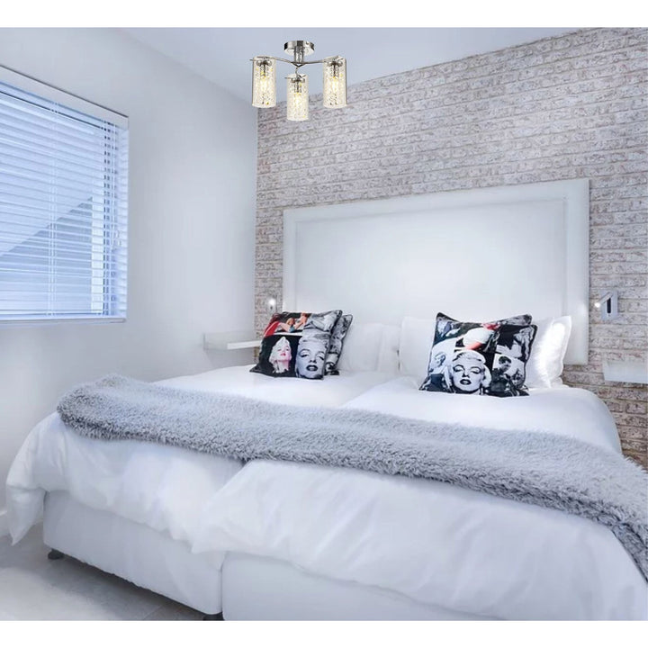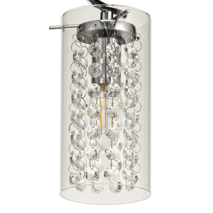 Available in either a 3, 5 or 8 light, the Minnie semi ceiling lights use stylish slim waved arms in polished chrome to hold the E14 lamp holders. Each lamp holder is encircled by a transparent cylindrical glass allowing a clear view of the crystal button strands that hang from the metal lamp holder cup within the glass. The crystal components add an attractive quality to a seemingly simple design which looks even more striking when the fitting is illuminated delivering an exquisite sparkle. Minnie also includes a complementing switched wall and table lamp.