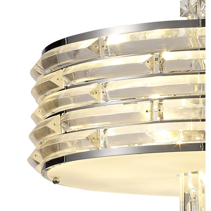 Hooley is an exquisite crystal fixture combining a variety of different high quality crystal components to amplify its distinctive presence. This ultra-modern creation begins with a waterfall of square crystal pieces stopping at the wider, originally formed frame with curved rows of long slim rectangular crystals inserted into minimalistic polished chrome metalwork. This section conceals the E14 lamp holders which can take a maximum of 40W. The cascading crystals resume beneath the frosted diffuser transforming from square pieces into more substantial rectangular crystals. Hooley's intricate facets make a fascinating crystal pendant which can be converted into a Semi Flush light if required.