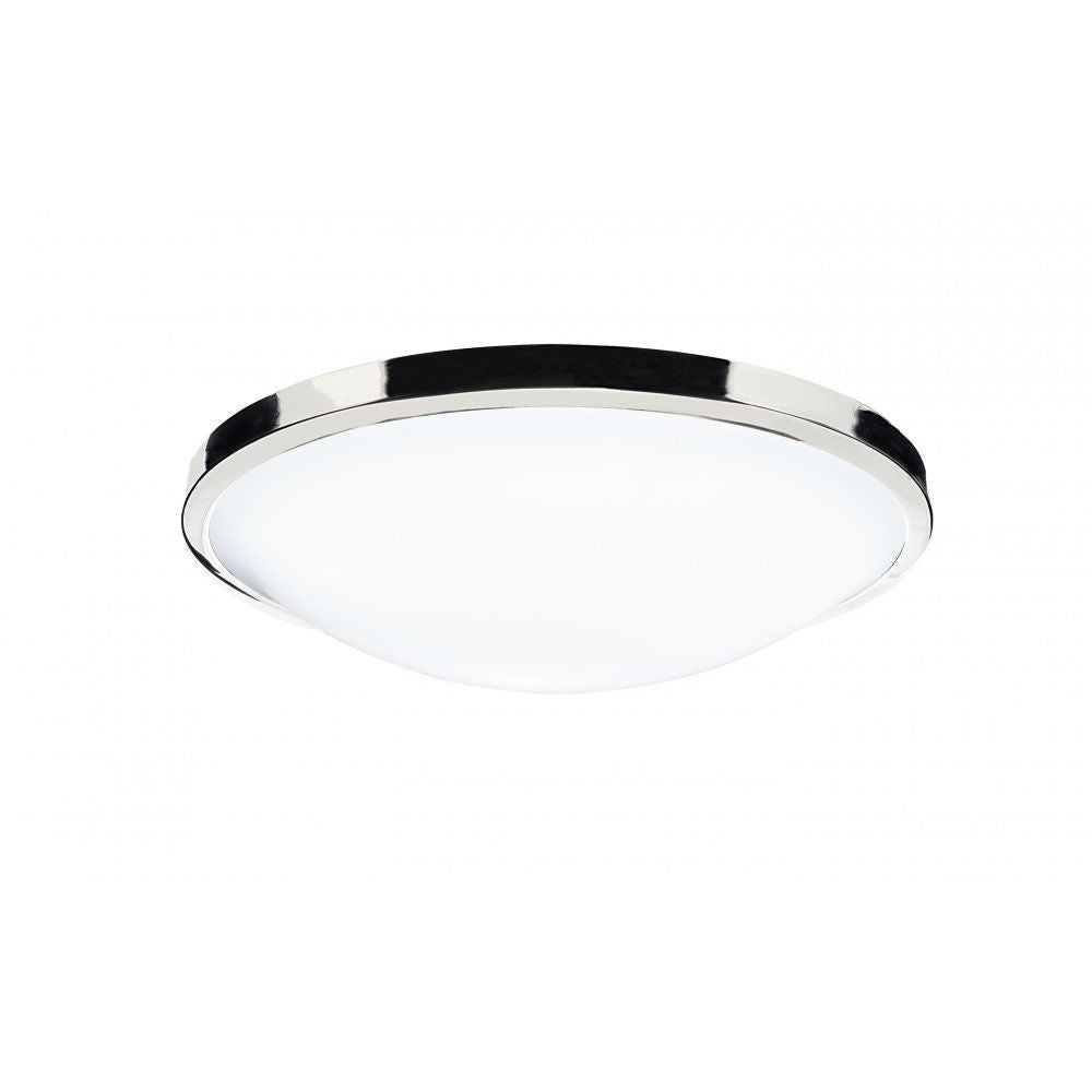 A round acrylic flush ceiling light with polished chrome trim. Double insulated. IP Rating: 44.