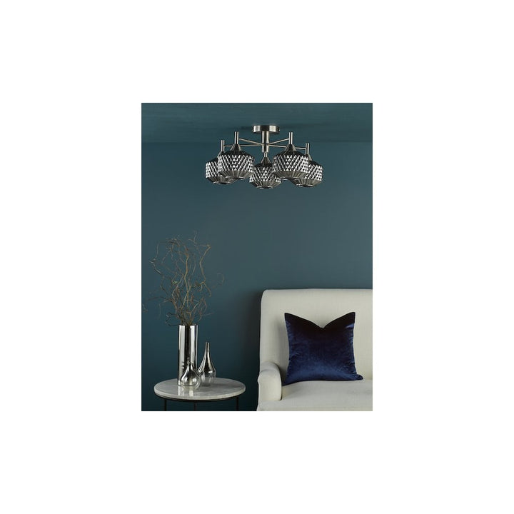 Illuminate your space with the Fabrienne Semi-Flush ceiling light from dar lighting, a stunning 5-light fixture that seamlessly blends style and functionality. This elegant design features a sleek satin nickel finish that complements any décor, while textured smoked glass shades add a sophisticated touch. Ideal for rooms with low ceilings, this semi-flush mount provides modern flair without overwhelming your space. The smoked glass diffuses light beautifully, creating a warm and inviting atmosphere perfect for living rooms, dining areas, or bedrooms. Whether your aesthetic is contemporary or transitional, the Fabrienne's versatile design enhances your home's overall look. Embrace the perfect balance of form and function with this eye-catching ceiling light that is sure to become a focal point in any room.This fixture requires five SES GB bulbs with a maximum wattage of 40W (bulbs not included), and dar lighting recommends using the BUL-E14-LED-15 bulb for optimal performance.