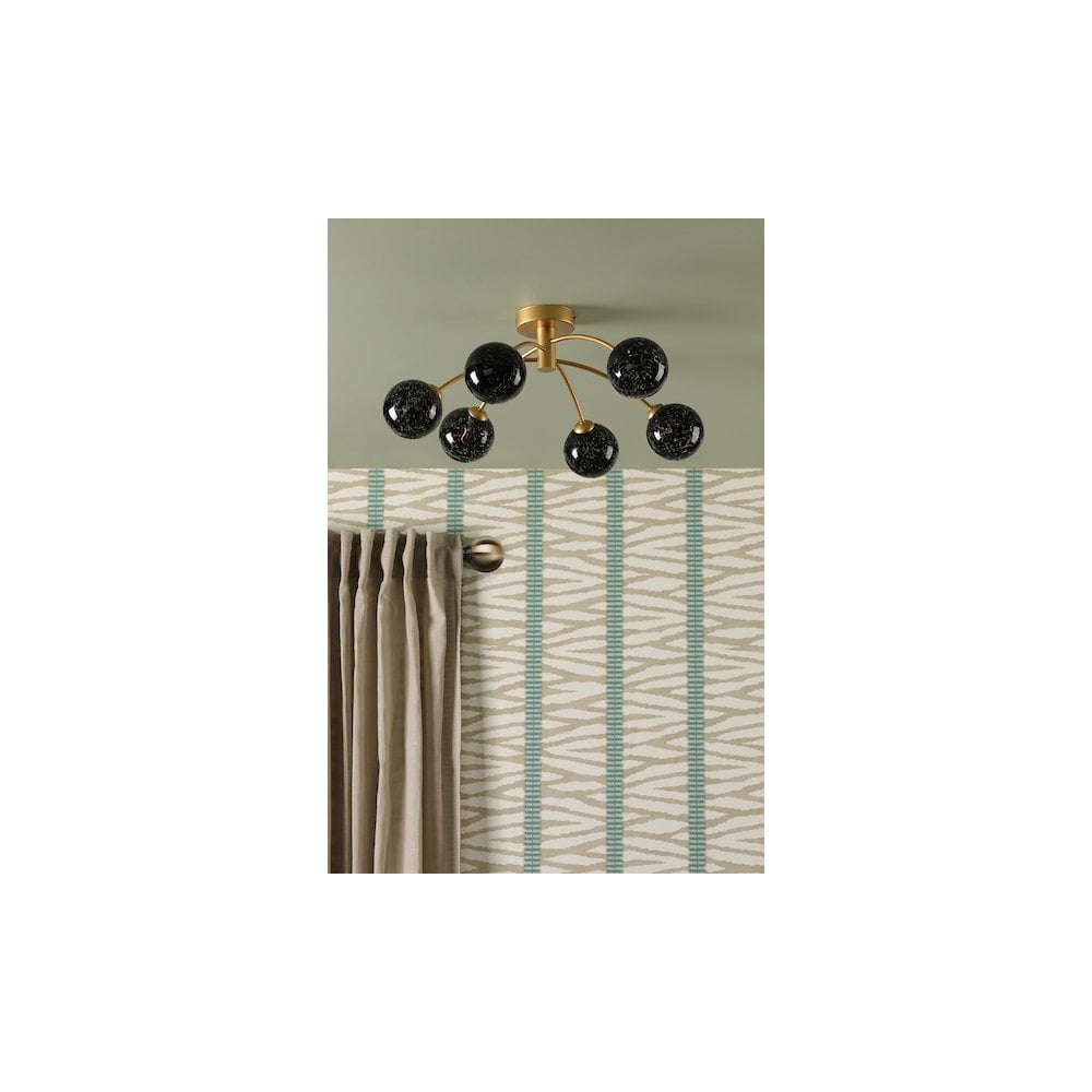 The Izzy 6 Light Semi-Flush in Polished Gold and Black Confetti Glass is a stunning semi-flush fitting that features a distinctive textured black and clear confetti glass shade that catches the light beautifully, creating an almost magical ambiance. Its elegant polished gold frame is designed for low ceilings, allowing the unique glass design to shine brightly. This versatile semi-flush light is perfect for entryways, dining rooms, or any space that requires a touch of style.The Izzy semi-flush requires six G9 bulbs (not included), and for optimal performance, the recommended bulb is BUL-G9-LED-3. This fixture not only serves as a functional light source but also as a stylish statement piece that elevates your interior decor.