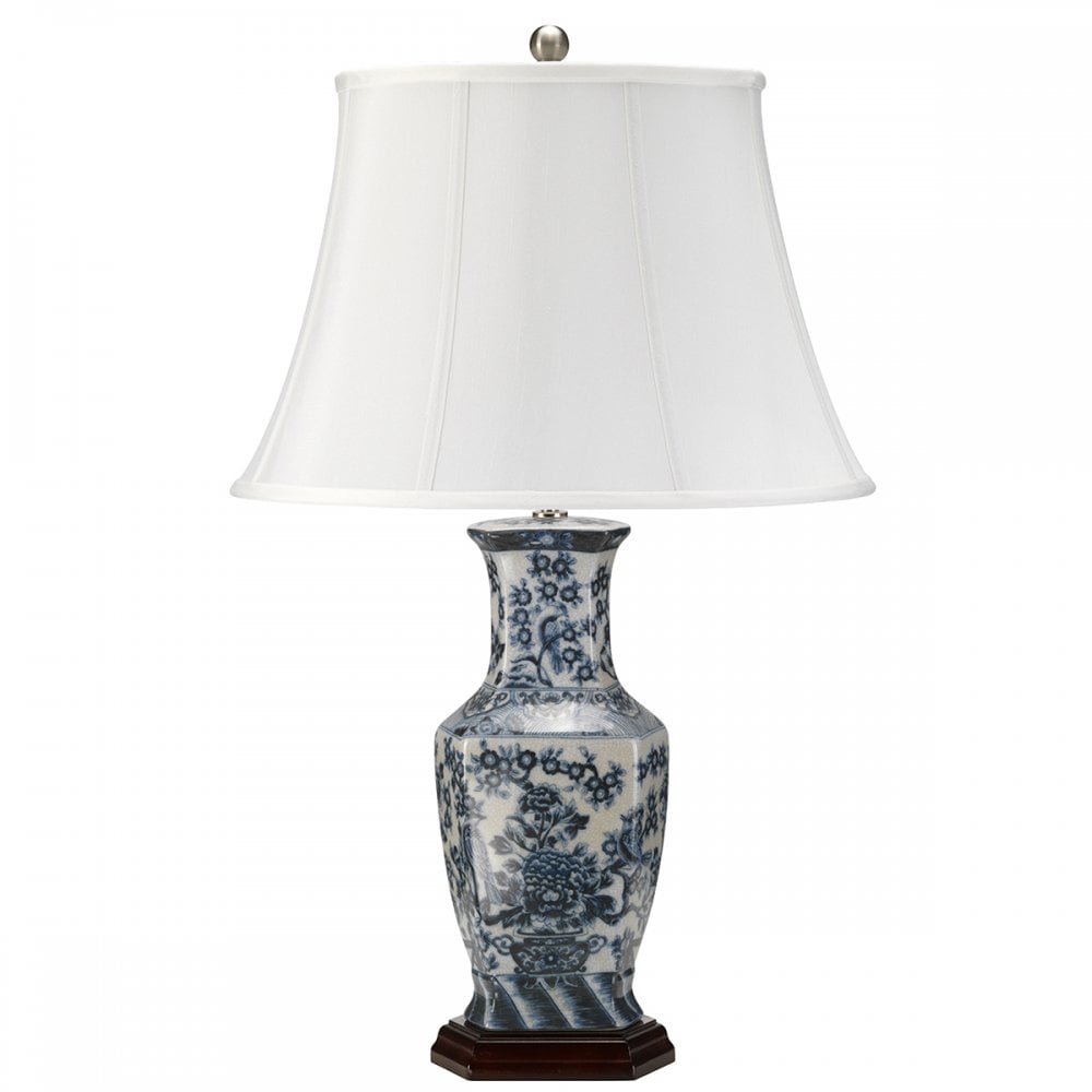 BLUE HEX/TL Blue hex 1 light table lamp. Blue and White Chinese Porcelain table lamp with a hexagonal shape and floral pattern. Fitted with a wooden base, White polycotton empire shade, and Satin Nickel finial.