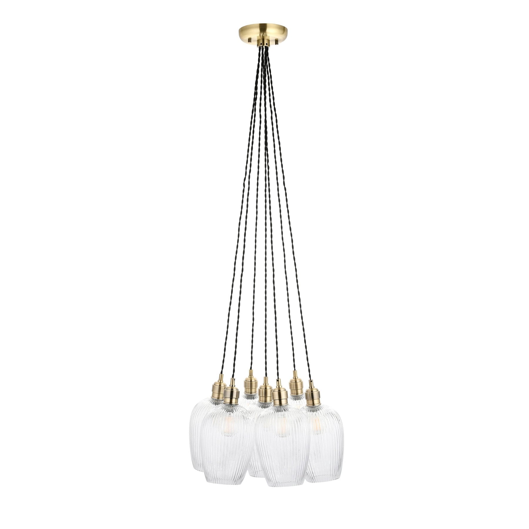 120655 7 Light Pendant Antique Brass Plate & Clear Ribbed Glass