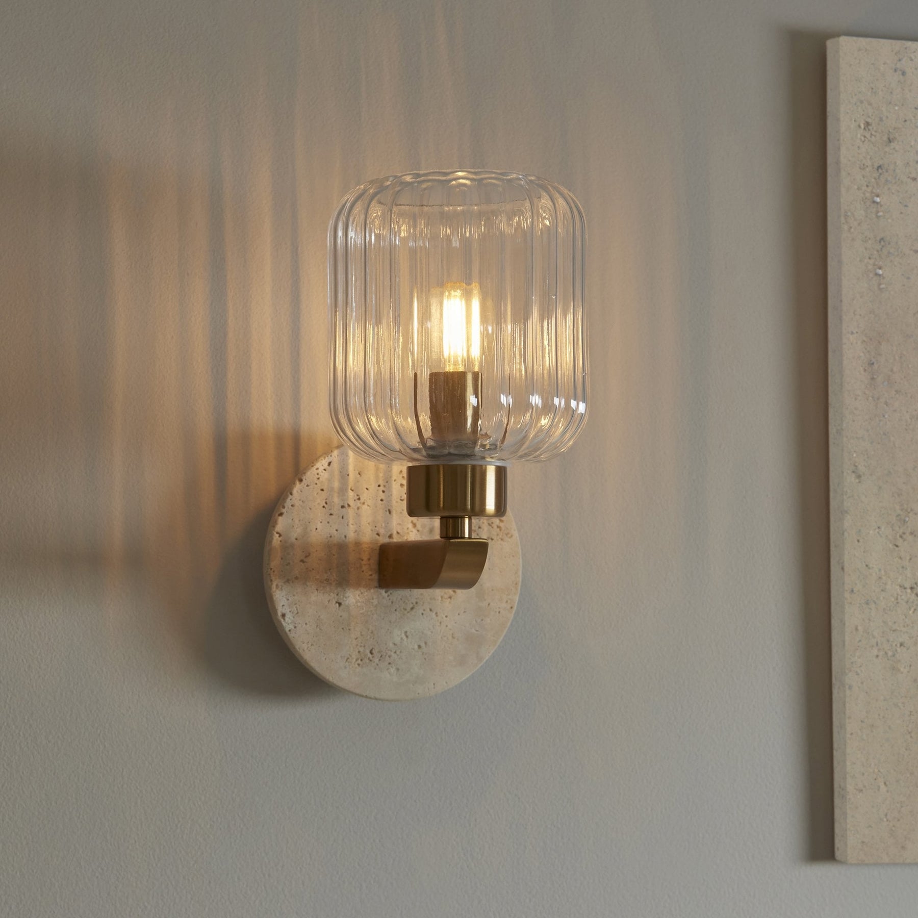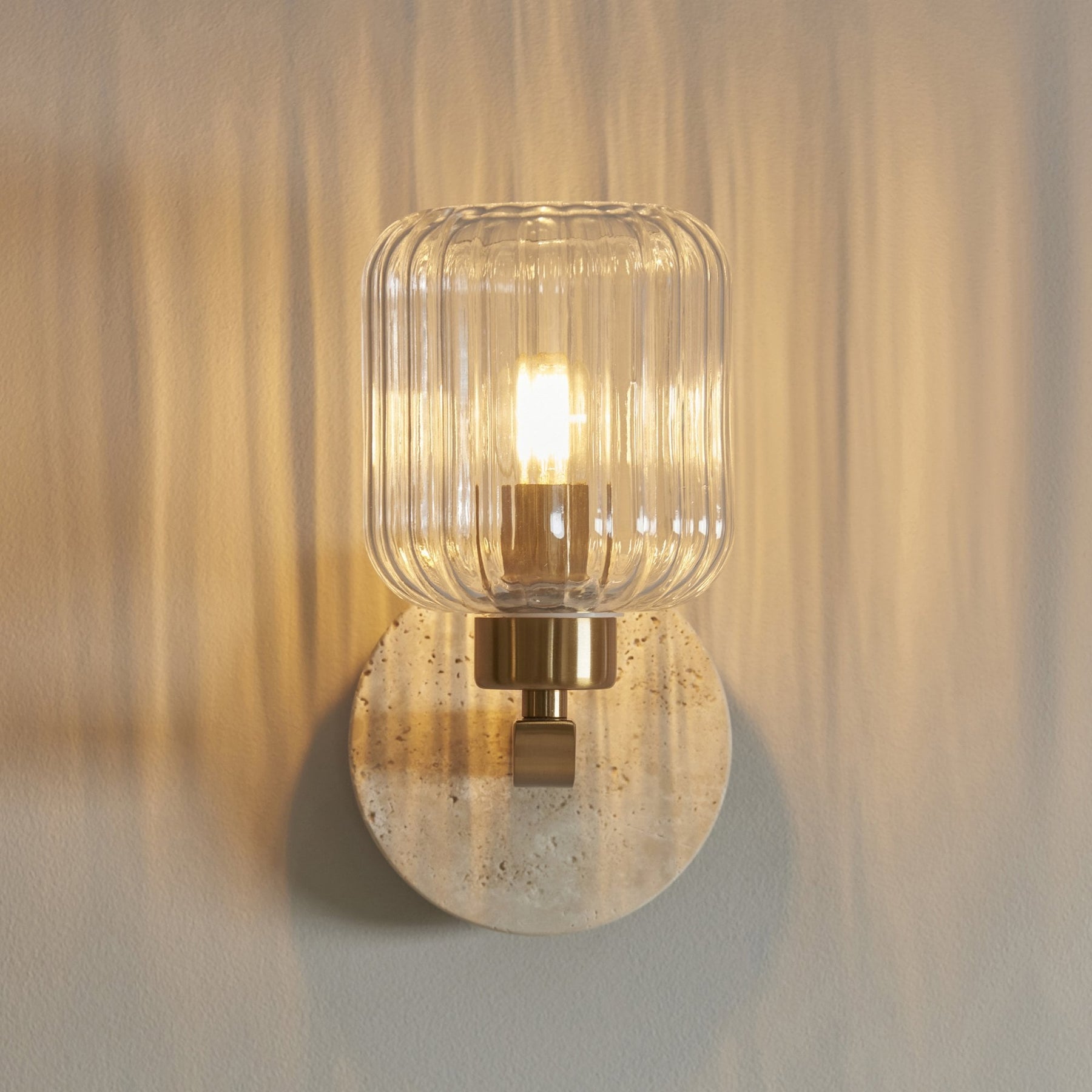 Bring refined elegance to your interior with this striking wall light, where contemporary design meets timeless materials. A solid travertine backplate provides a luxurious foundation for the sleek warm brass arm, which supports a minimalist clear ribbed glass shade that reveals the warm glow of the bulb inside. Ideal for hallways, living spaces, or bedside settings, this wall light offers a soft ambient glow while adding a sculptural touch to your decor.