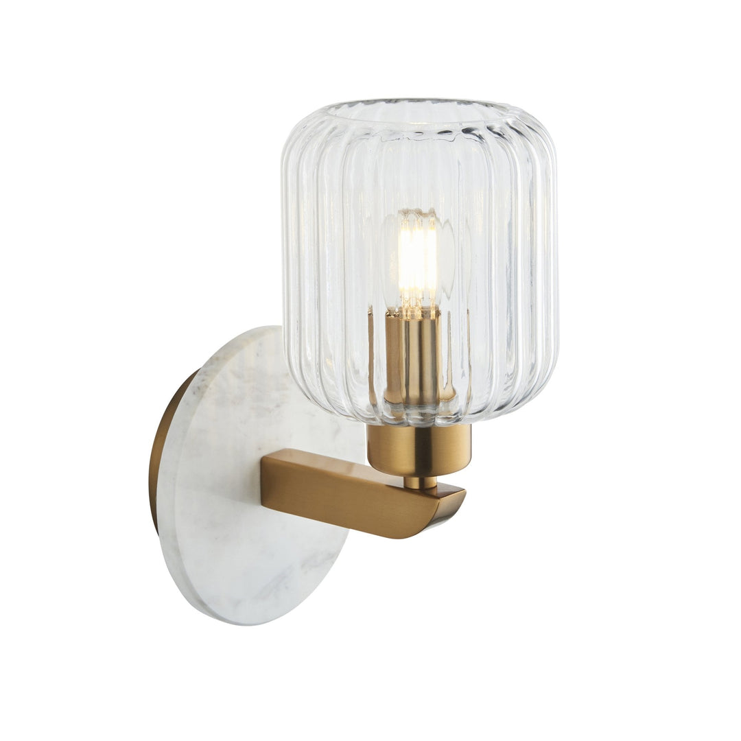 Endon 120666 Travi Ribbed Wall Light White Volakas Marble, Vintage Brass & Clear Ribbed Glass