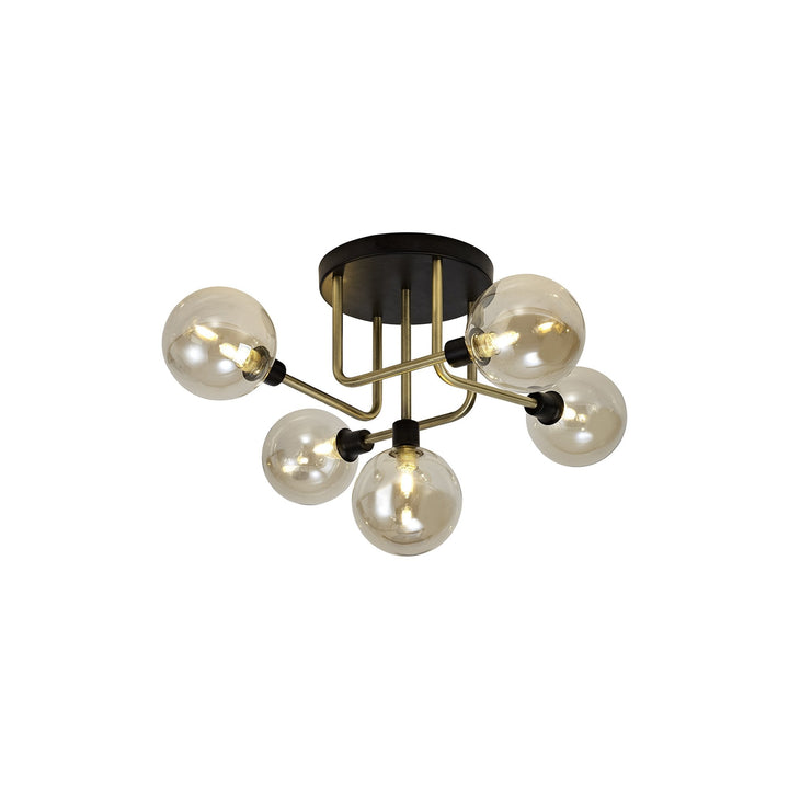 Dylon Flush Ceiling 5 Light Matt Black/Antique Brass/Cognac Glass