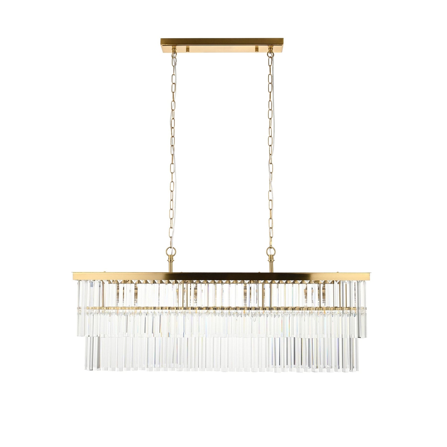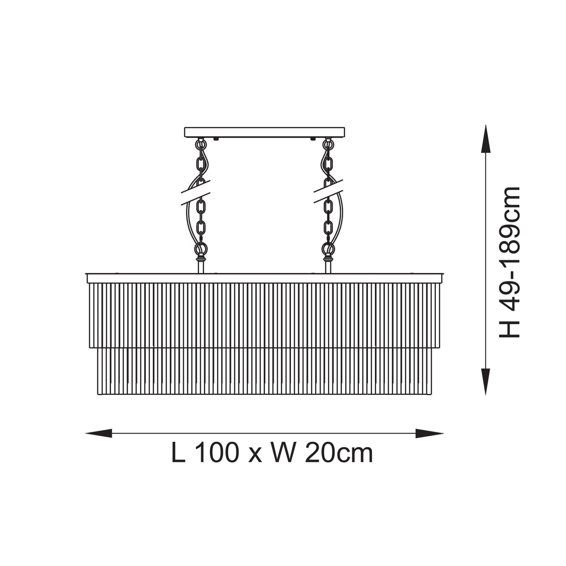 Sleek and sophisticated, this 4-light linear pendant is designed to bring refined glamour to elegant dining rooms. A series of angled glass droppers cascade from a shaped metal band, catching the light for a dazzling effect. Suspended from twin height-adjustable chains, the balanced, elongated form makes it ideal for positioning over dining tables or kitchen islands, offering both ambient glow and visual drama.