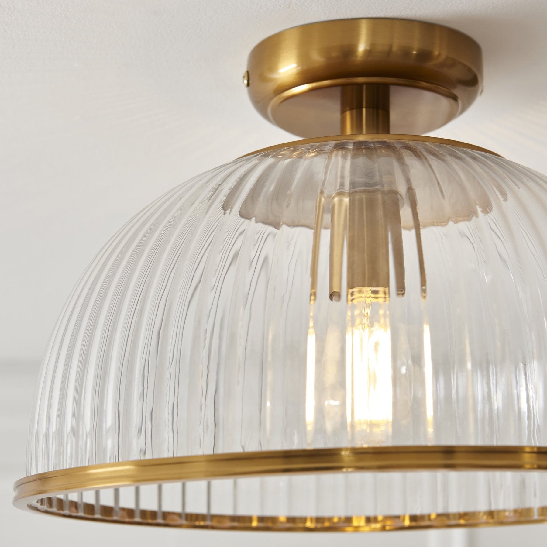 Bring elegance to your ceiling with this E27 flush ceiling light, featuring a ribbed dome-shaped clear glass shade that diffuses warm illumination with refined charm. The warm brass banding and base add a touch of vintage sophistication, making it an ideal statement piece for hallways, kitchens, or bedrooms, ideal for lower ceilings where style is essential.