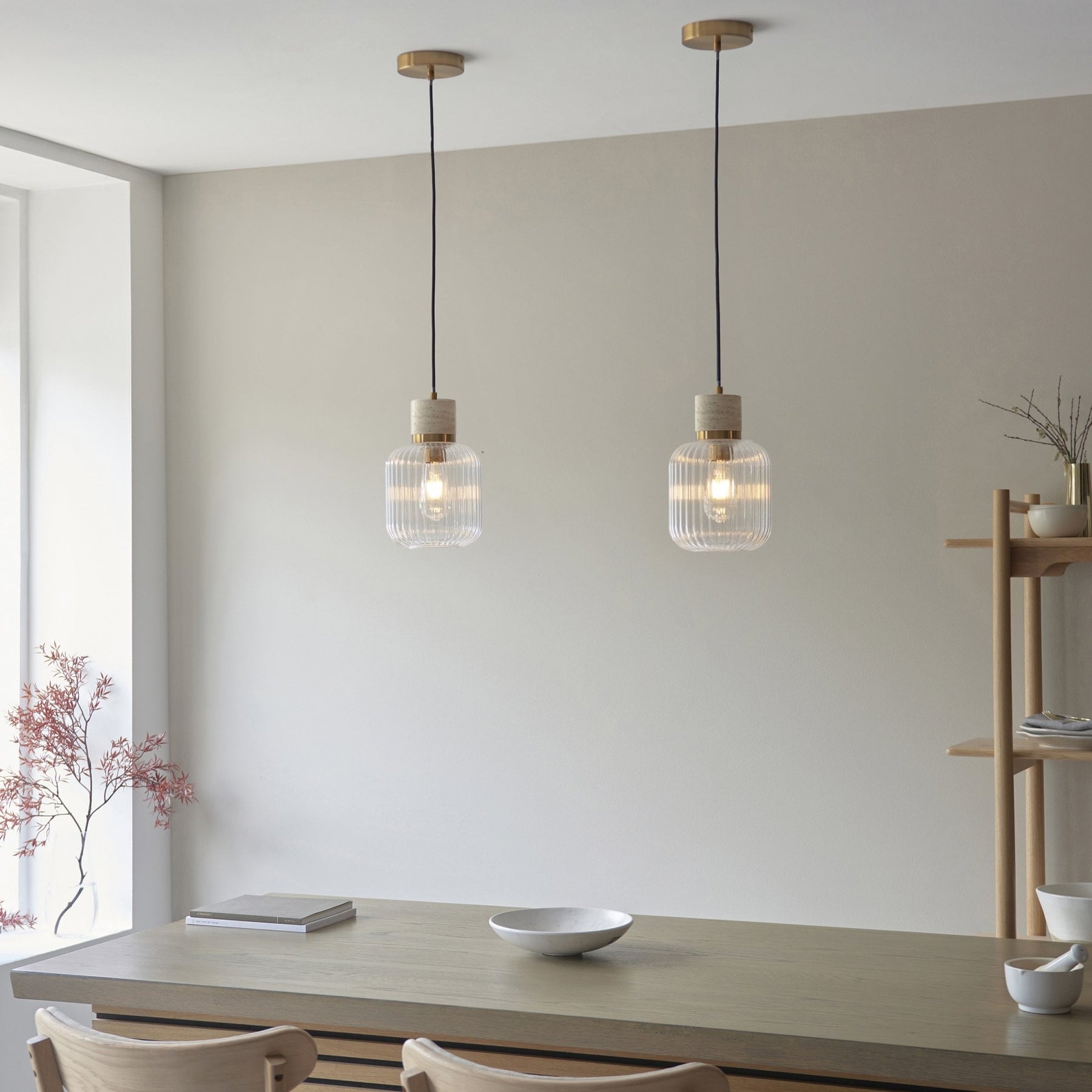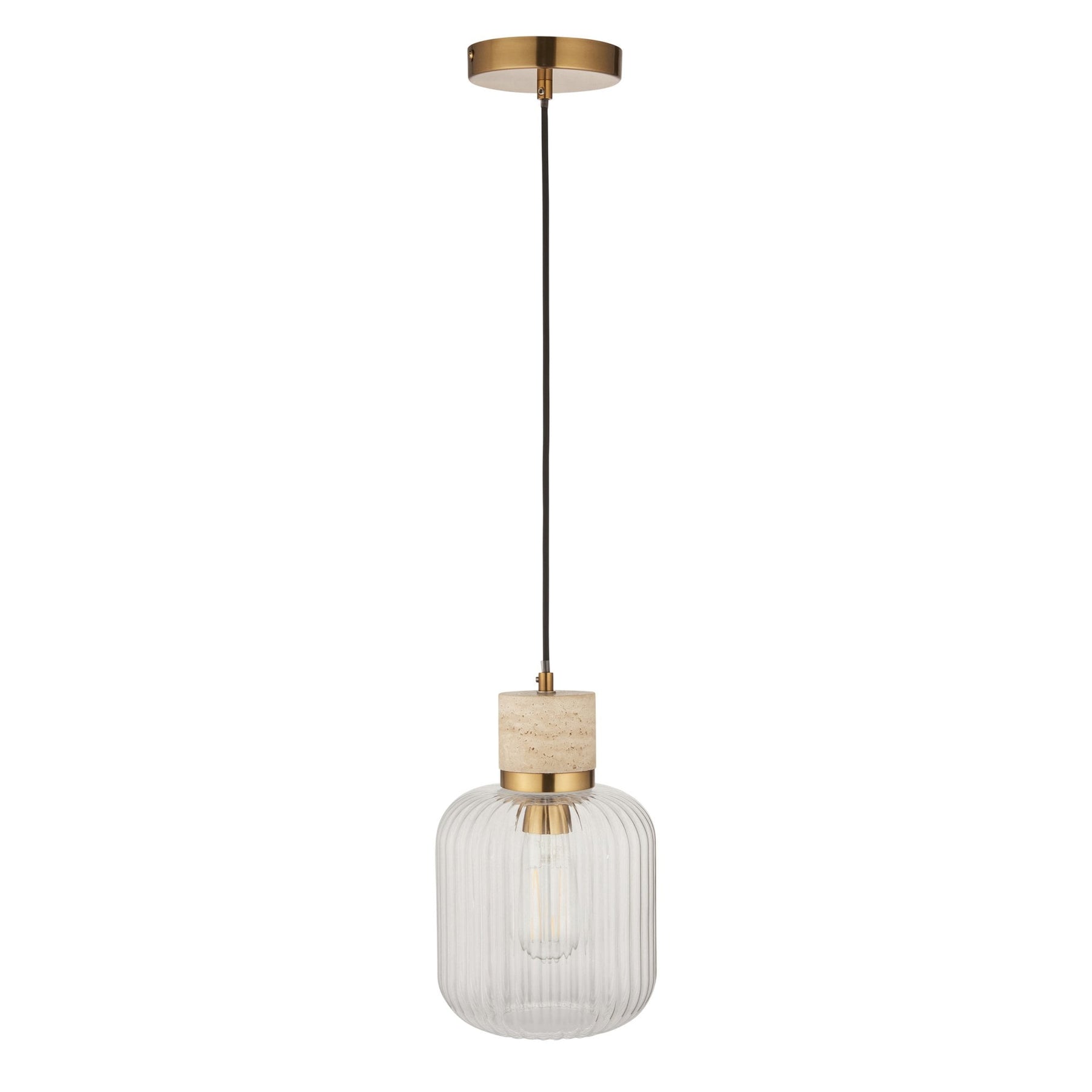 Elevate your interiors with this effortlessly stylish single pendant light, combining natural textures with sleek metallic accents. A smooth travertine stone top pairs beautifully with a warm brass collar, suspending a softly rounded clear ribbed glass shade that showcases the bulb within. Hung from a matching brass ceiling rose with a slim black fabric flex, this pendant makes a striking feature over kitchen islands, dining tables, or in contemporary living spaces. Understated yet elegant, it offers a perfect balance of modern refinement and organic warmth.