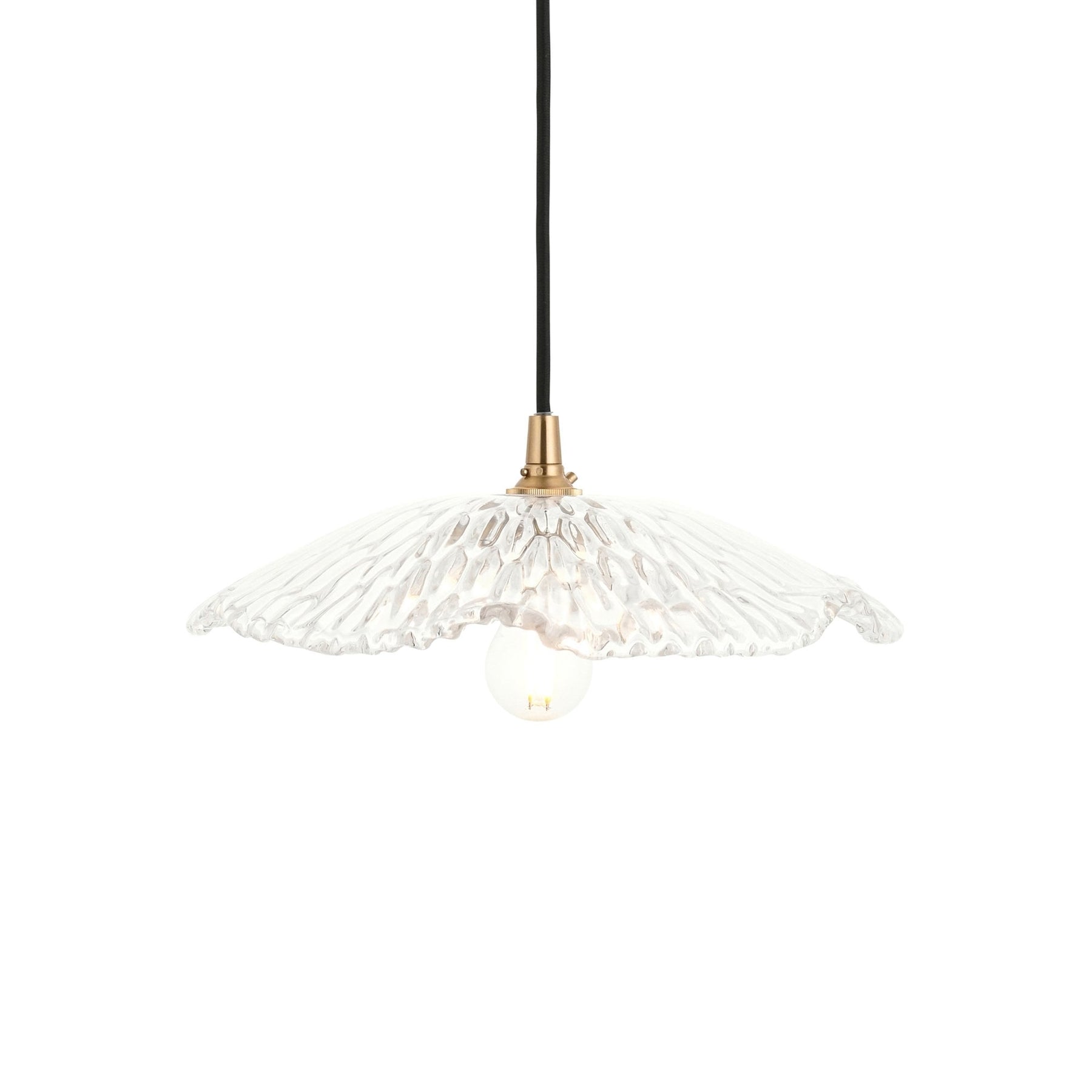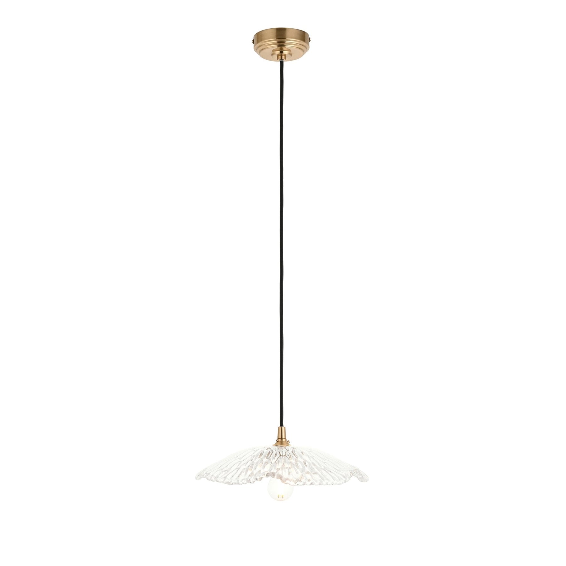 Delicately sculpted with a rippled, shell-like texture, this decorative heavy clear glass shade brings a touch of French-inspired elegance to any setting. Its organic silhouette and artisan-crafted clarity offer a classic decorative feel while diffusing light with soft brilliance. Suspended from a classically styled black braided fabric flex set with warm brass details, adding vintage sophistication to any room. Ideal for kitchens, hallways, or bedrooms.