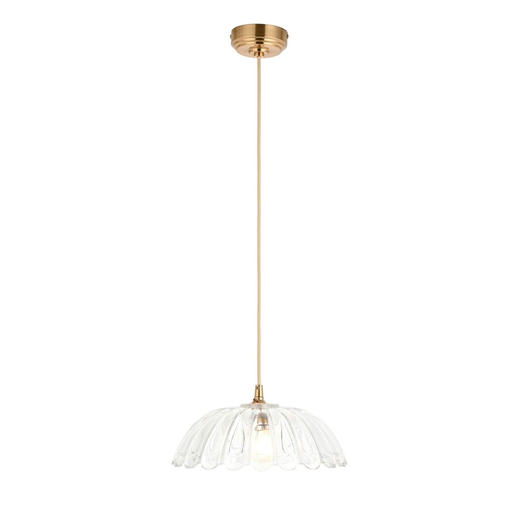 Elegant and timeless, this decorative heavy clear glass shade takes inspiration from classic French design, featuring a gentle dome scalloped form that diffuses light beautifully while adding artistic charm. Suspended from a classically styled parchment colour braided fabric flex set with warm brass details, adding vintage sophistication to any room. Ideal for kitchens, hallways, or bedrooms.