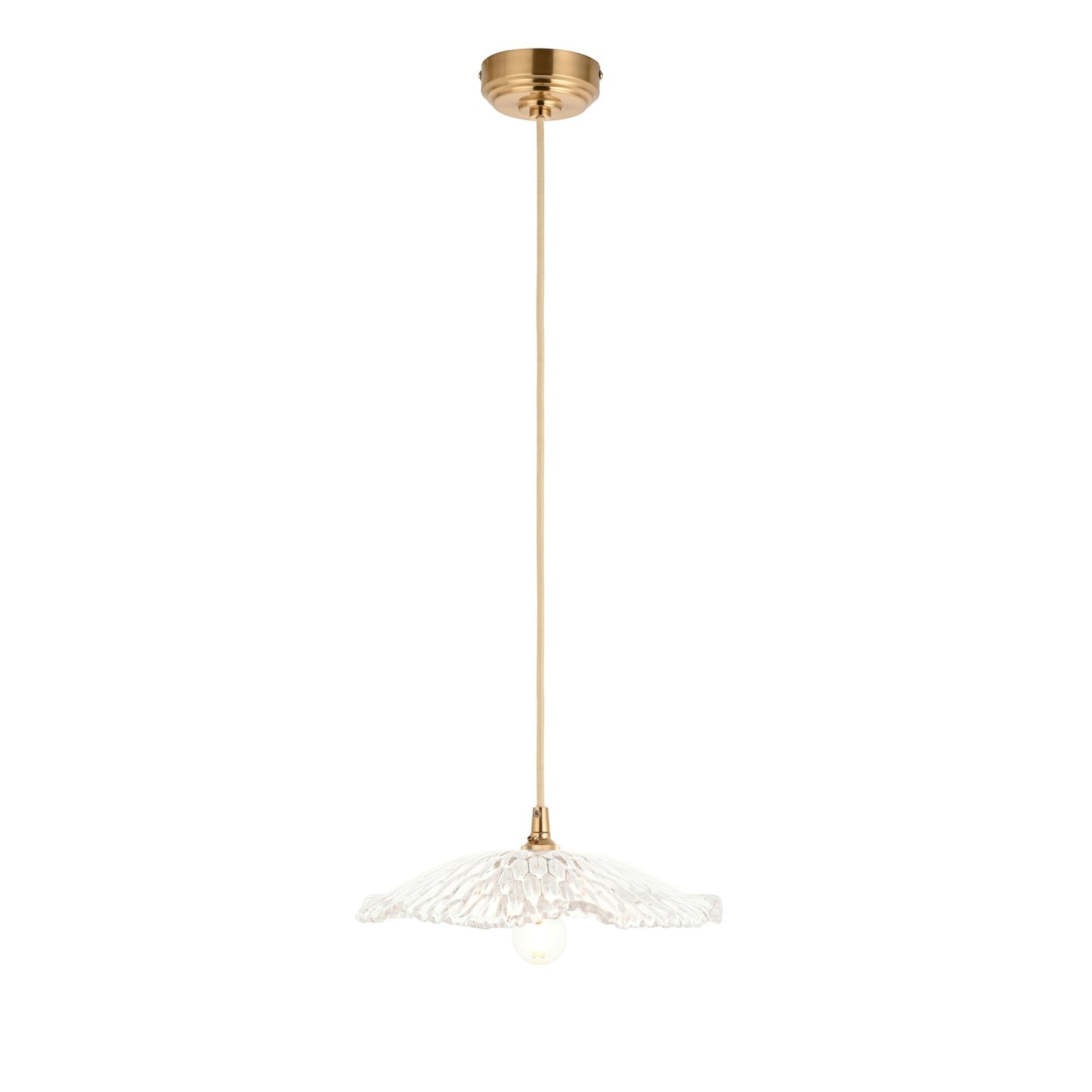 Delicately sculpted with a rippled, shell-like texture, this decorative heavy clear glass shade brings a touch of French-inspired elegance to any setting. Its organic silhouette and artisan-crafted clarity offer a classic decorative feel while diffusing light with soft brilliance. Suspended from a classically styled parchment braided fabric flex set with warm brass details, adding vintage sophistication to any room. Ideal for kitchens, hallways, or bedrooms.