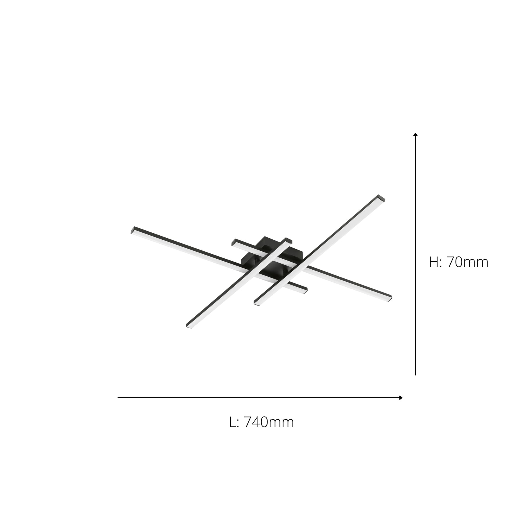 The EGLO Vascella ceiling light is a bold and modern lighting solution designed to brighten up any indoor space with style. Featuring a large 740 mm square frame in sleek black steel with a white plastic diffuser, this fixture delivers a powerful 2500 lumens of crisp 4000K white light. Its integrated 20W LED includes a convenient 3-step dimming function, allowing you to adjust brightness levels via a standard wall switch. With its ultra-slim 70 mm profile and energy-efficient performance, the Vascella is perfect for contemporary living rooms, hallway or offices.