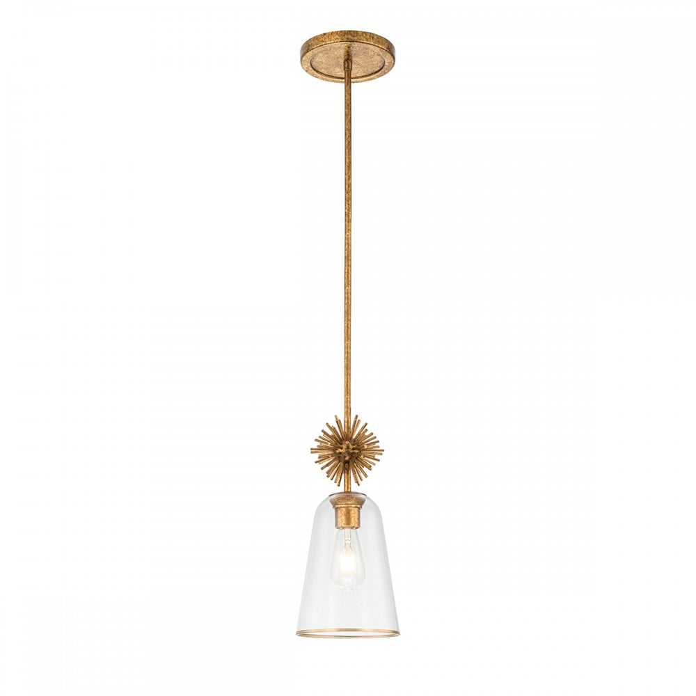 Staring mini pendant with clear glass and in a distressed gold finish.