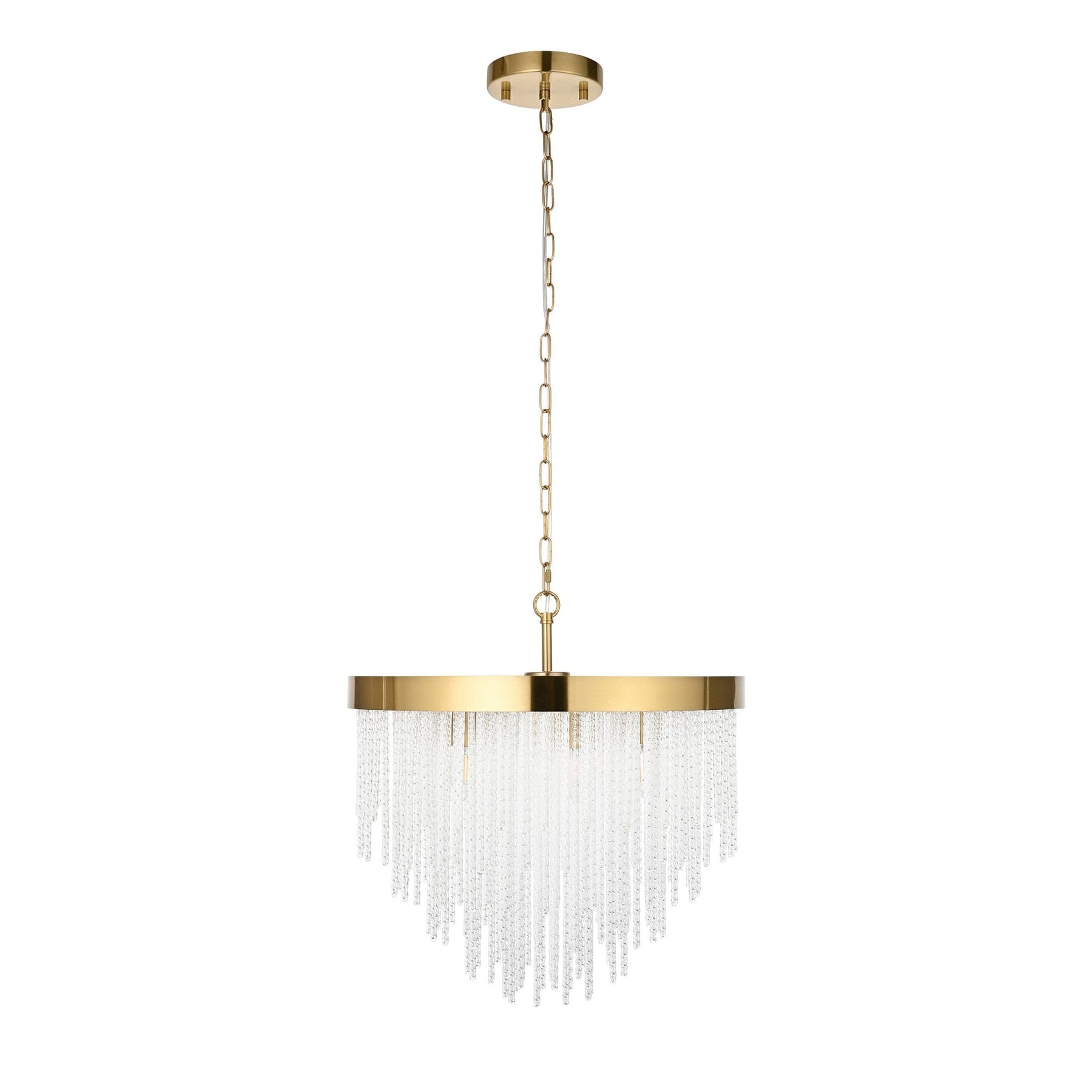 Add a touch of opulence to your home with this 5-light E14 ceiling pendant. Featuring a warm brass-finished frame and an elegant arrangement of elongated, textured glass rods, this statement piece creates a dazzling cascade of light. The tiered design adds depth and sophistication, making it ideal for dining rooms, lounges and bedrooms, delivering both ambient illumination and refined style in equal measure.