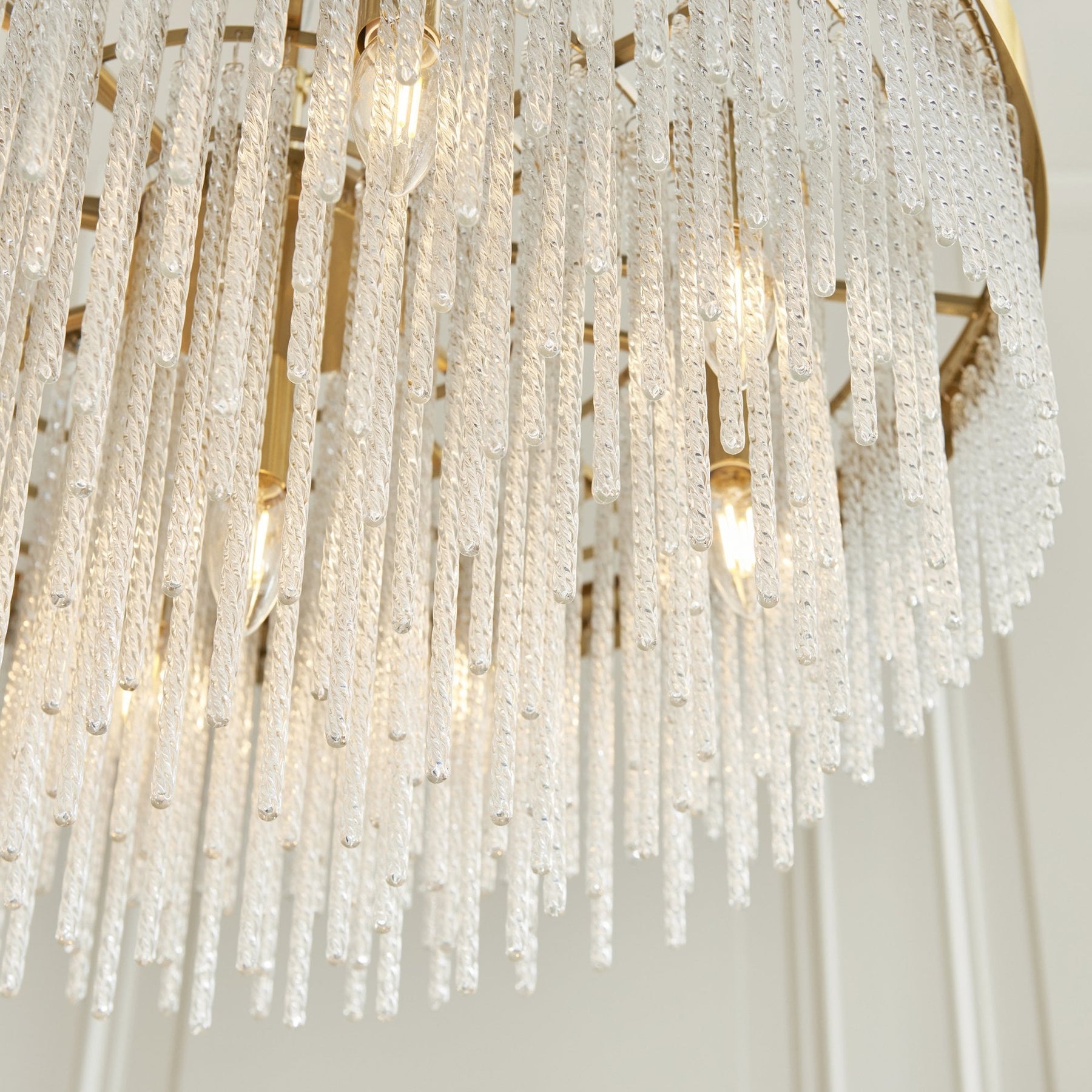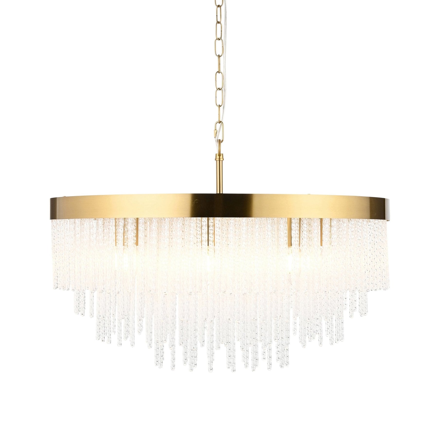 Make a bold design statement with this stunning 9-light ceiling pendant. Showcasing a luxurious warm brass-finished frame and an intricate arrangement of textured glass rods, this fixture exudes glamour and elegance. The generous scale and cascading silhouette create a dramatic focal point, ideal for dining rooms, stairwells, lounges, bedrooms and entryways. With space for nine bulbs, it delivers brilliant illumination while the shimmering glass details add depth and sophistication to any interior.