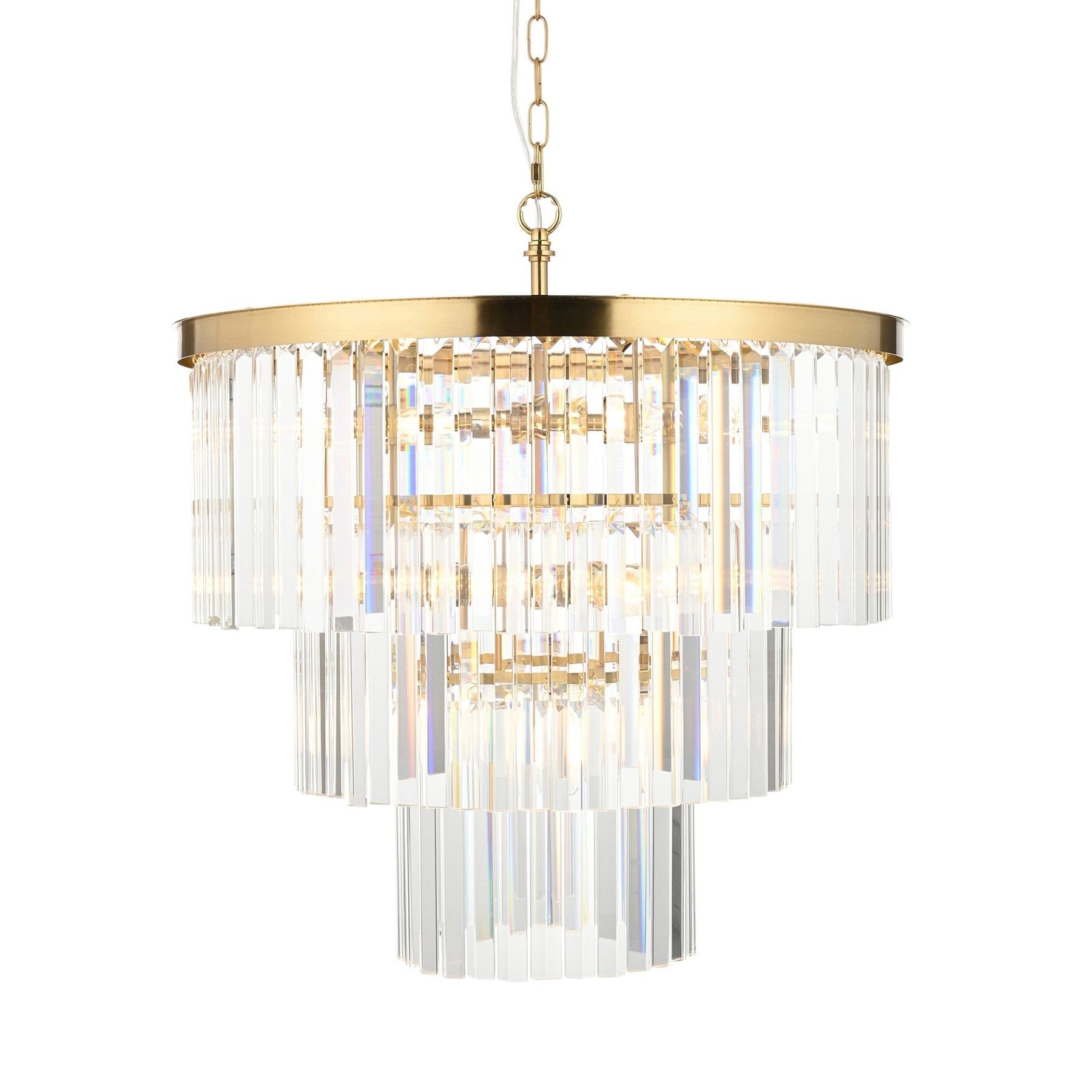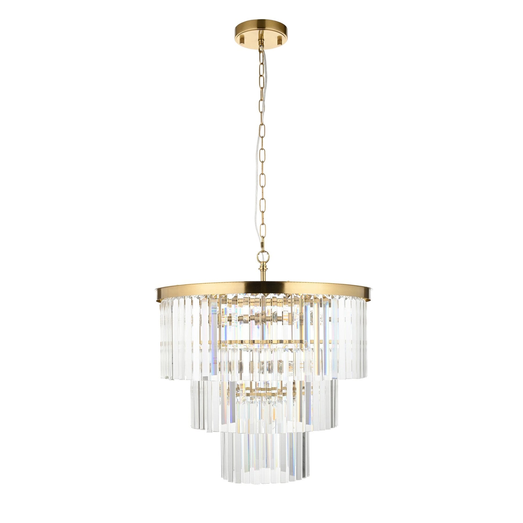Opulent and eye-catching, this seven-light pendant is a true statement piece featuring cascading tiers of angled glass droppers that shimmer with elegance. The sculptural design is crowned by a shaped metal band in a lustrous brushed brass finish, bringing structure and contrast to the fluid glass arrangement. Suspended from a height-adjustable chain, it offers a luxurious focal point ideal for grand entryways, lounge, bedrooms, dining rooms, or stairwells.