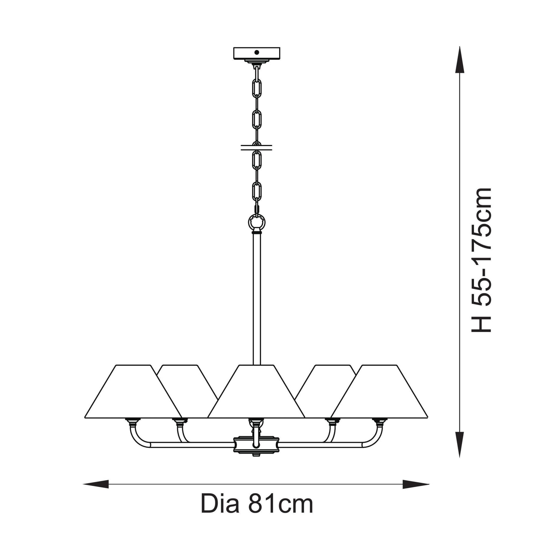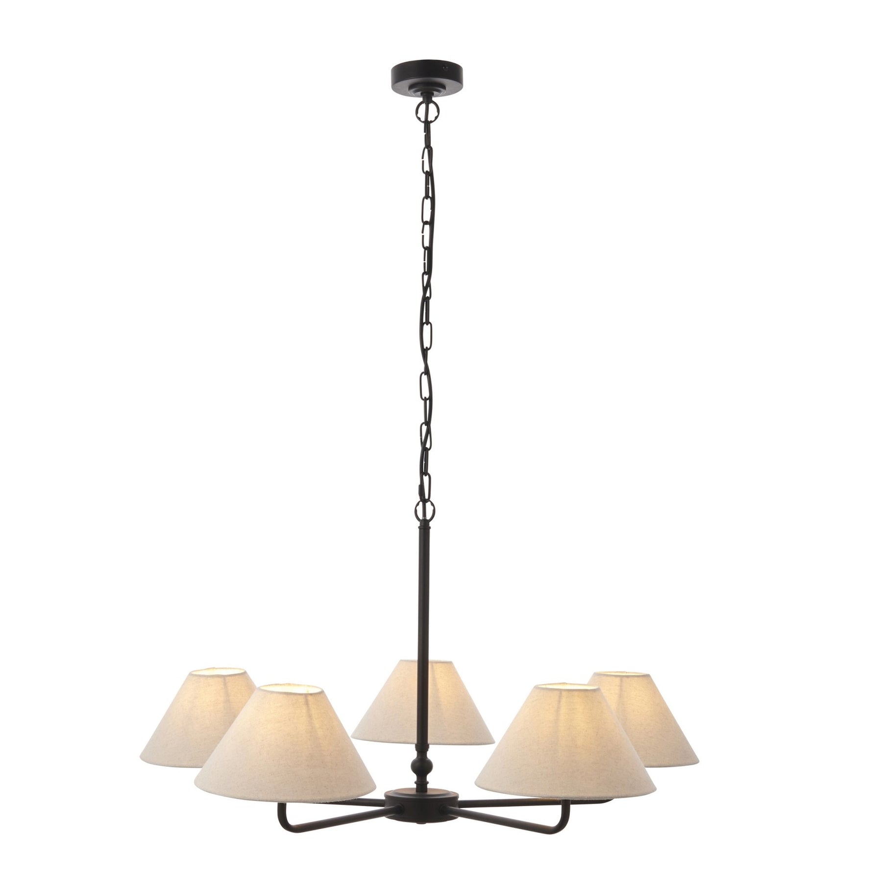 This elegant 5 light pendant is finished in matt black and features timeless tapered shades in natural linen fabric. Complete with B22 lamp holders for an authentic classic look. Matching items available.