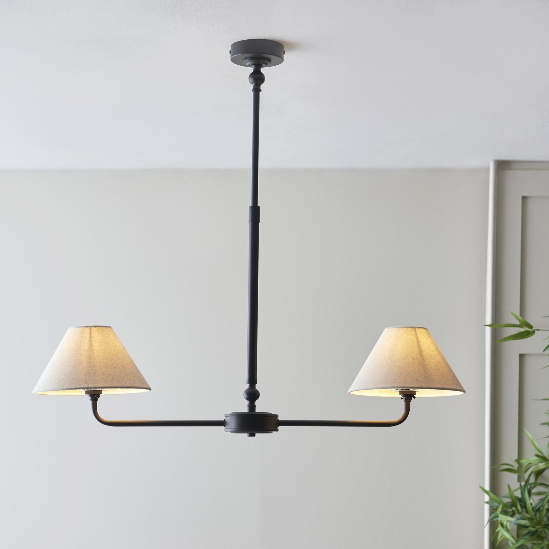 This elegant 2 light pendant is finished in matt black and features timeless tapered shades in natural linen fabric. Its linear shape makes it perfect for positioning over dining tables and comes complete with a height adjustable telescopic stem and B22 lamp holders for an authentic classic look. Matching items available.