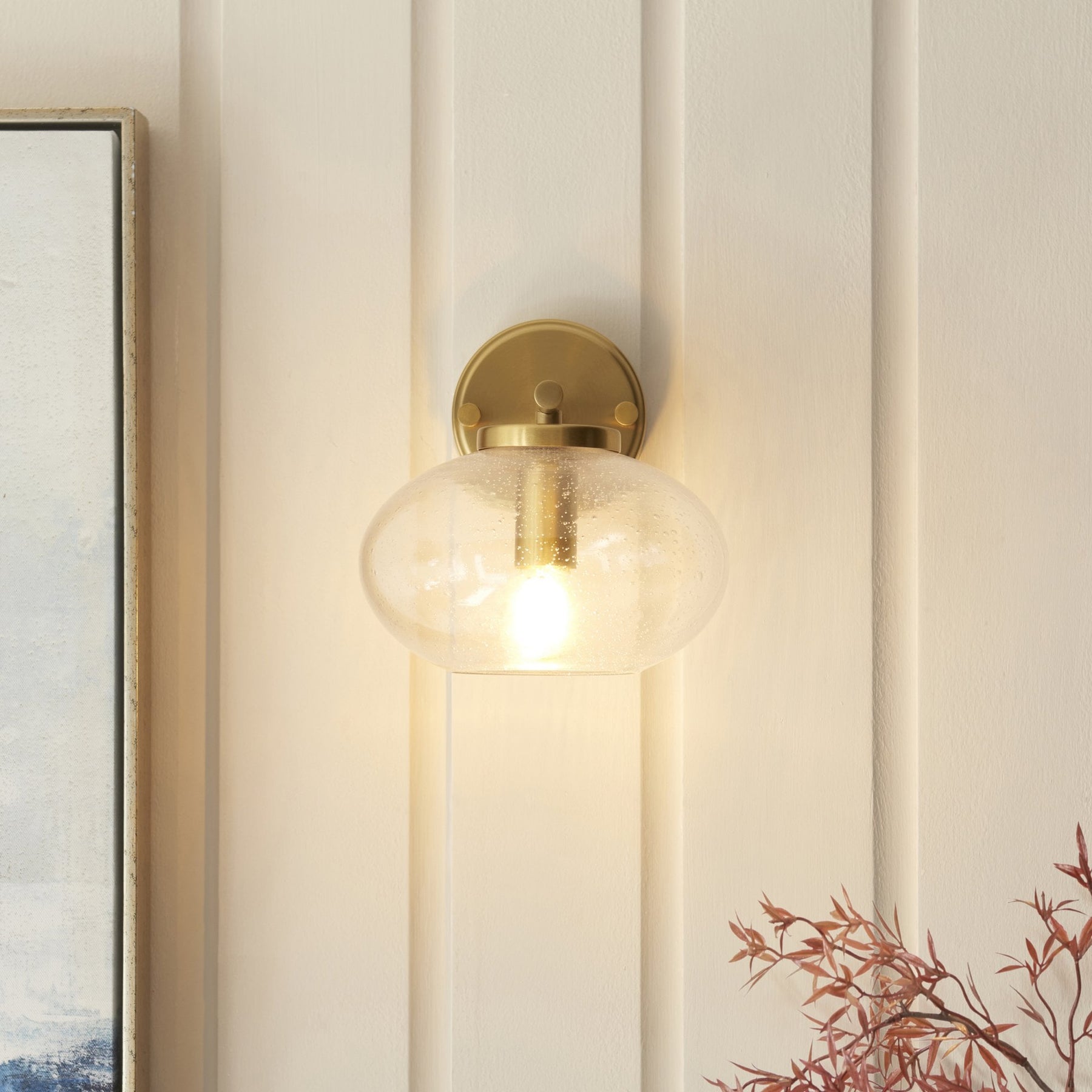 Blending classic curves with modern simplicity, this single wall light features a linear arm in a warm brass finish with a hand-blown clear bubbled glass shade. Each globe subtly distorts and enhances the light, creating a gentle sparkle that adds atmosphere to any room. Perfect for living areas, bedrooms, or hallways, it brings sculptural elegance and timeless design to contemporary interiors.