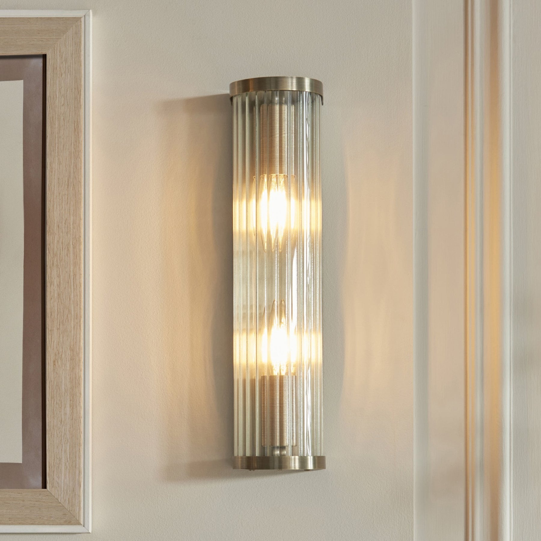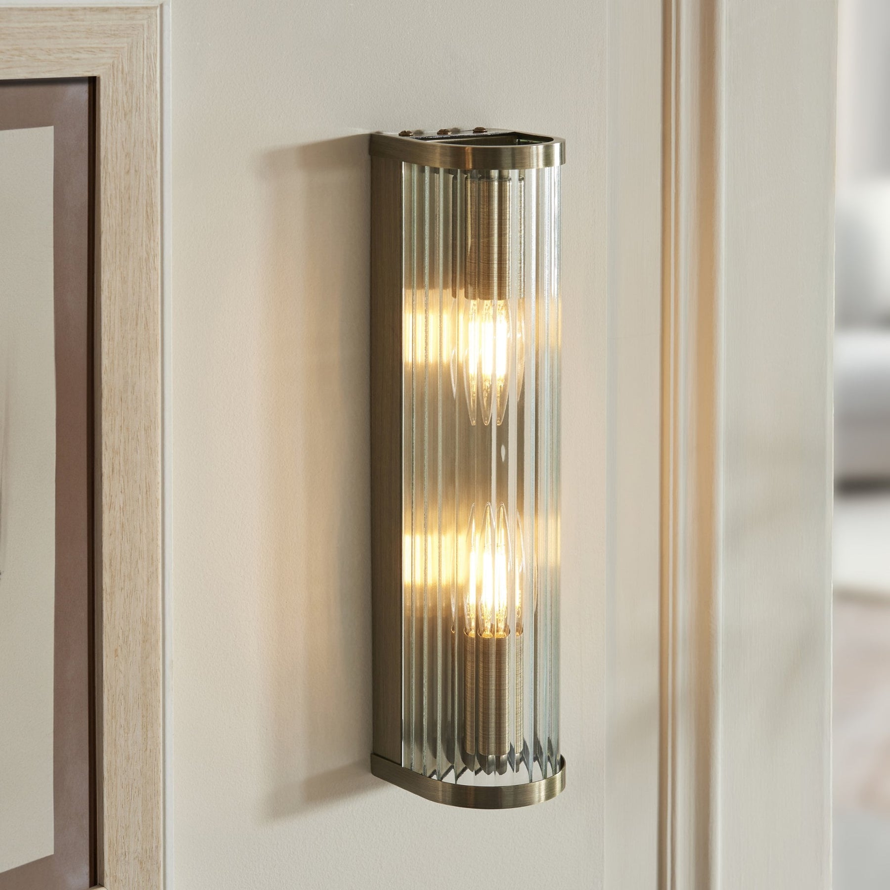 This 2 light wall light extends the same refined design as smaller single light but with double the impact. Its elongated form and dual light source ensure ample illumination, while maintaining the same antique brass finish and ribbed glass detailing. Ideal for feature walls or larger interior spaces, this piece combines functional lighting with timeless design appeal.