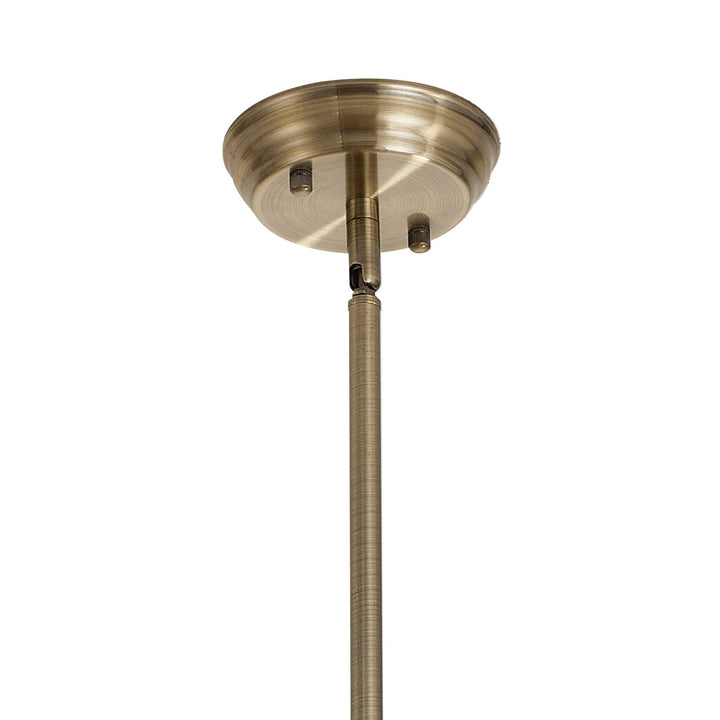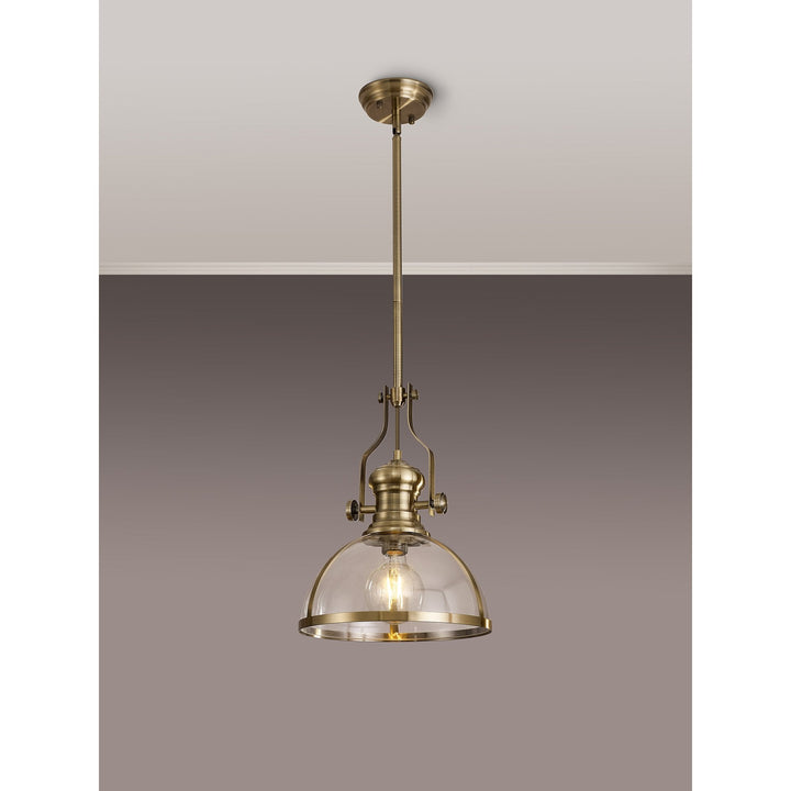 The Nelson Lighting NL7262/AB9 Louis 1 Light Pendant seamlessly blends traditional elements with a contemporary form. The antique brass finish and clear glass detailing provide a sophisticated aesthetic, suitable for a variety of decors.