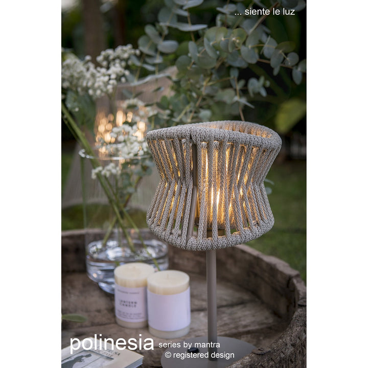 The Polinesia range sees an earthy raw material essence replicated with modern materials. A wicker design structured from textilene rope, forms the various pendant lights, table lamps and floor lamp. Perfectly finished with a beige oscu colour to reflect natural weaving reeds. The E27 lampholders enable the wider choice of wattages and colour temperatures to use with this range. This IP44 organic concept will bring a homely feel to any exterior setting.