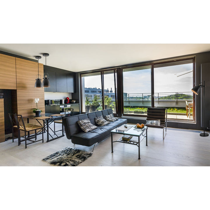 Bojam is a comprehensive range which awards a number of original features to a classic design concept. A familiar metal, narrow domed shade houses the E27 lamp holder on a selection of pendants and matching wall, table and floor lamp. Our designers have given these adjustable fixtures a modern twist firstly with the colour finishes of each component. The majority of the fittings have a matt black finish with the lamp holders and adjustable bolts coated in antique brass. The most unique colour is on the inside of each shade which has a khaki finish; in order to further accentuate this whilst also adding another feature, the edge around the outer rims of the shades have small oval cut outs to display the inner shade and create fascinating shadows when illuminated.