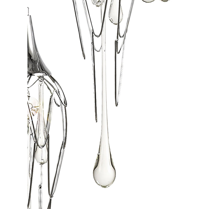 Istan is a range of multiple pendants and complementing wall lamp, that takes the concept of a melting icicle one step further, not only using long clear crystal drops that mimic a falling drop of water but also shaping the frame which hosts them into a similar statement. The polished chrome metal frames are bent and curved like slowly cascading water which the smaller crystal drops and GU10 lamp holders sit inside.