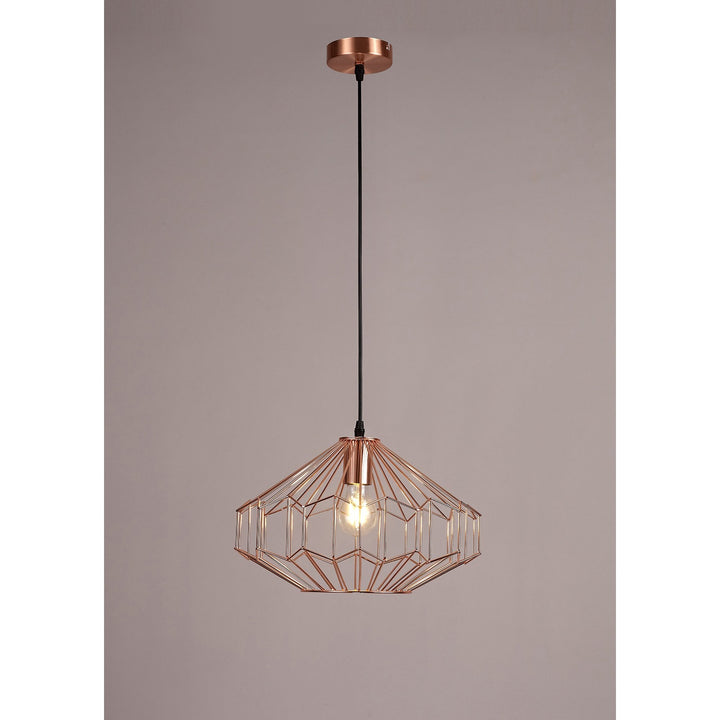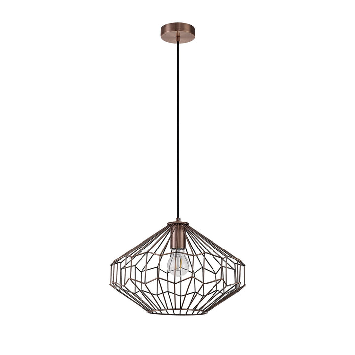 With geometric shapes and form, the Valerie range includes two pendants finished in a stunning Antique Copper/Black, ideal for use within a traditional atmosphere or even to bring a touch of contemporary ambience to a modern space. The wired format of the metalwork allows an open uninhibited dispersal of light from the E27 lamp holder. Both lights take a maximum 60W ensuring an extensive amount of illumination is achievable.