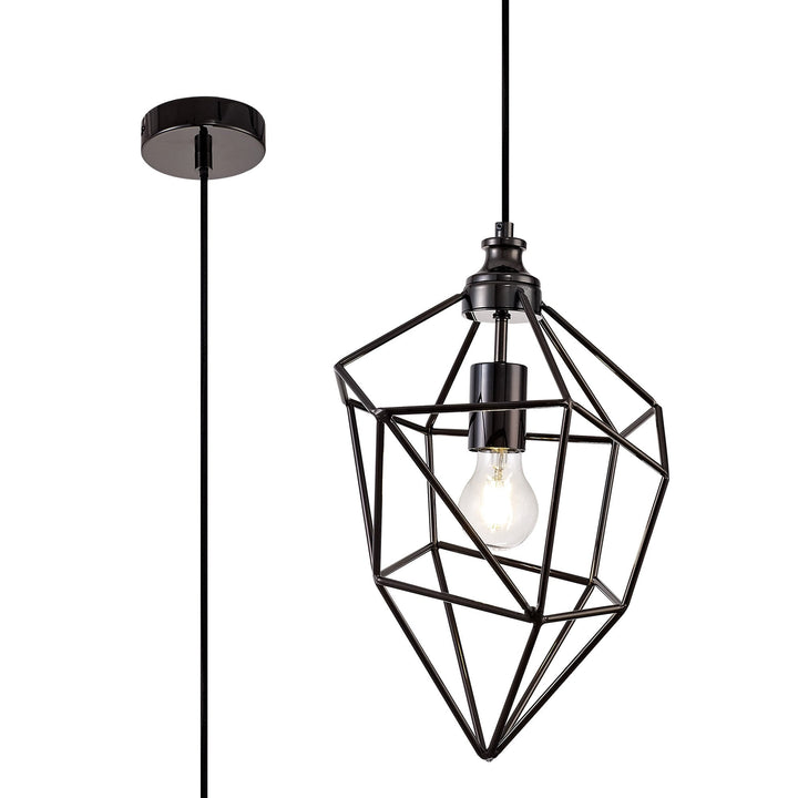 The open areas of the Davie single pendants form an uninhibited ambient light distribution. Numerous different irregular shapes form the metal framework in three high quality colour options producing an overall acorn shape with distinctive narrow angled point. Available in three size these E27 pendants are sure to complement any modern, edgy setting.