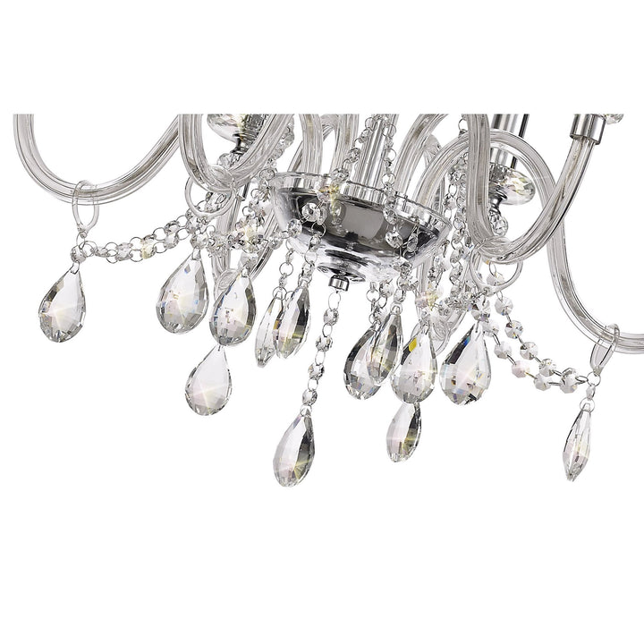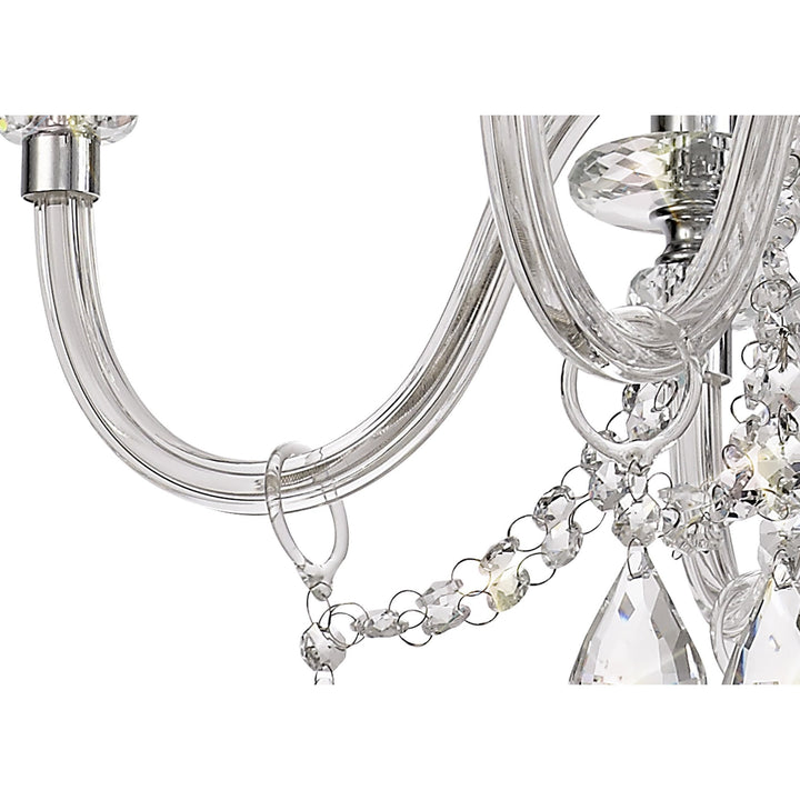 Our designers have taken a classic chandelier design and replaced traditional components with more specialised modern parts to present a more contemporary collection. Glastonbury's standard metal arms have been swapped with clear glass which are each draped with high quality clear crystal buttons and tear drops. Further strands of crystal buttons are draped along the centre column for further glamour. An originally cut crystal sconce sits beneath each lamp holder, with a smaller diameter but greater depth this piece is highly faceted for even more spectral arrays. The polished chrome pendants are available in five sizes ranging from a four light to a spectacular three tier light. Glastonbury also now includes two table and floor lamps to accompany the complementing wall lamps.