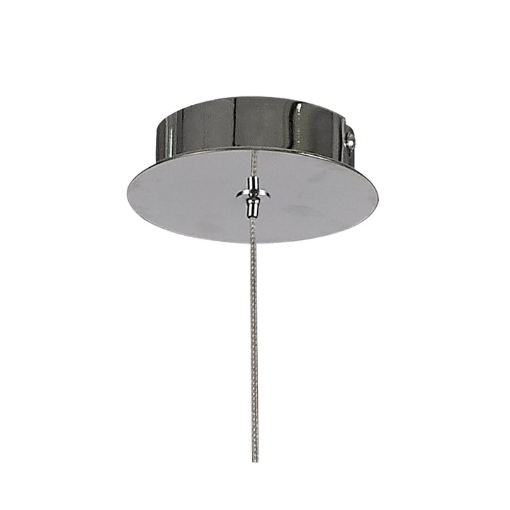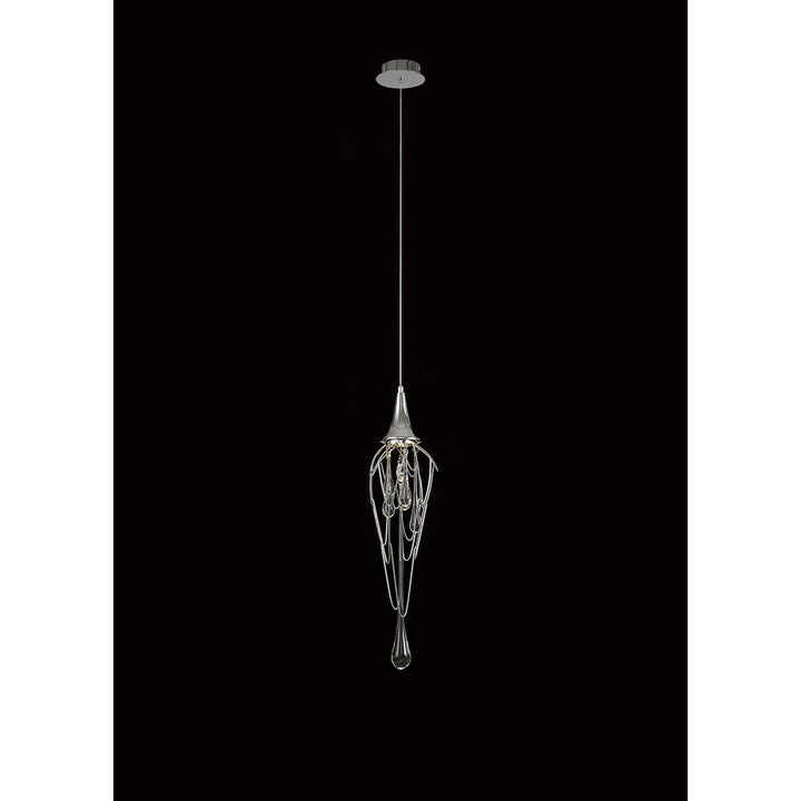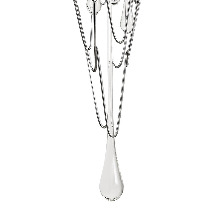 Istan is a range of multiple pendants and complementing wall lamp, that takes the concept of a melting icicle one step further, not only using long clear crystal drops that mimic a falling drop of water but also shaping the frame which hosts them into a similar statement. The polished chrome metal frames are bent and curved like slowly cascading water which the smaller crystal drops and GU10 lamp holders sit inside.