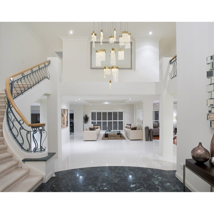 Our inventive designers have taken newly popular design concepts and combined them to make a stunning new range, Bartoo. The multiple pendant light, single pendants and wall lamp are available in a painted brush gold finish which offsets perfectly against the 3000K integral LEDs. Each staggered drop hosts a glass piece moulded to reflect crystallised ice which sits beneath the gold bands in which house the LEDs. These items are visually dazzling when illuminated yet still intriguing when the lights are not in use.