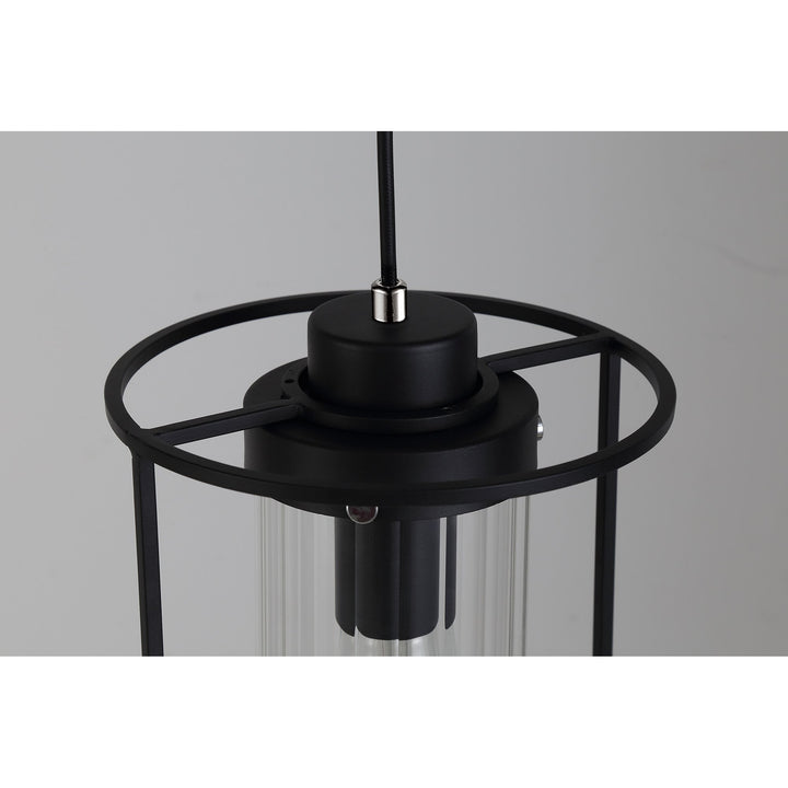Riannon is a complete collection including a linear three light pendant and singular one light pendant, with matching wall and table lamps available. The subtle line effect moulded into the glass cylinders, which sit around the E27 lamp holders, give the impression of caging around the lamp enhancing the minimalistic design of the slim black framework.