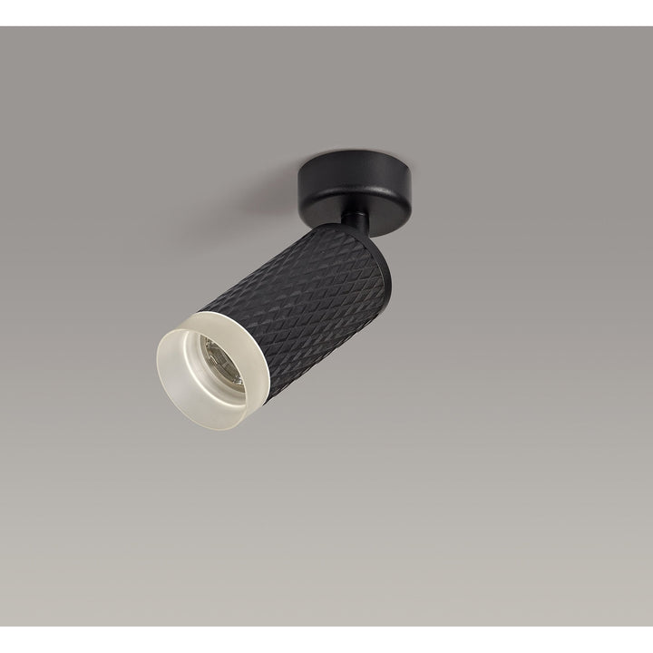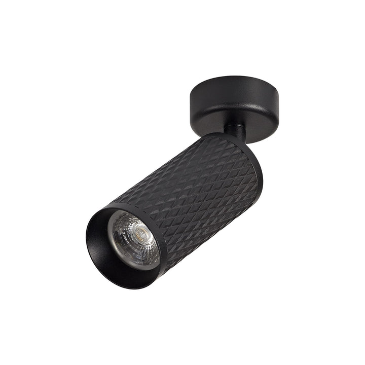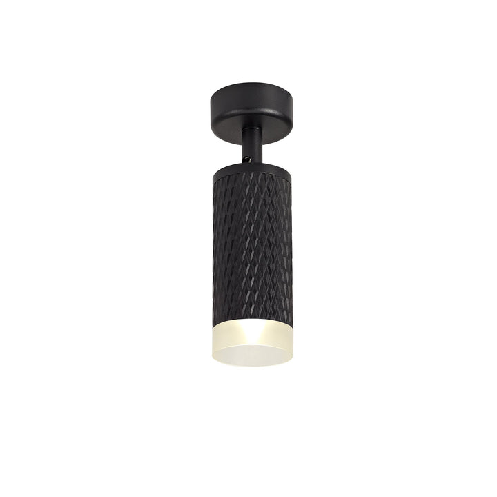 The cylindrical format of the Silence range is decorated with a diamond imprint producing a mesh like effect. These light fittings are available as a surface mounted ceiling fitting, wall lamps, track spotlight or surface mounted adjustable spotlight. The wide variety of colour finishes available, complementing face ring accessories and the pendant kit offers a greater number of lighting solutions for all kinds of room settings and applications.
