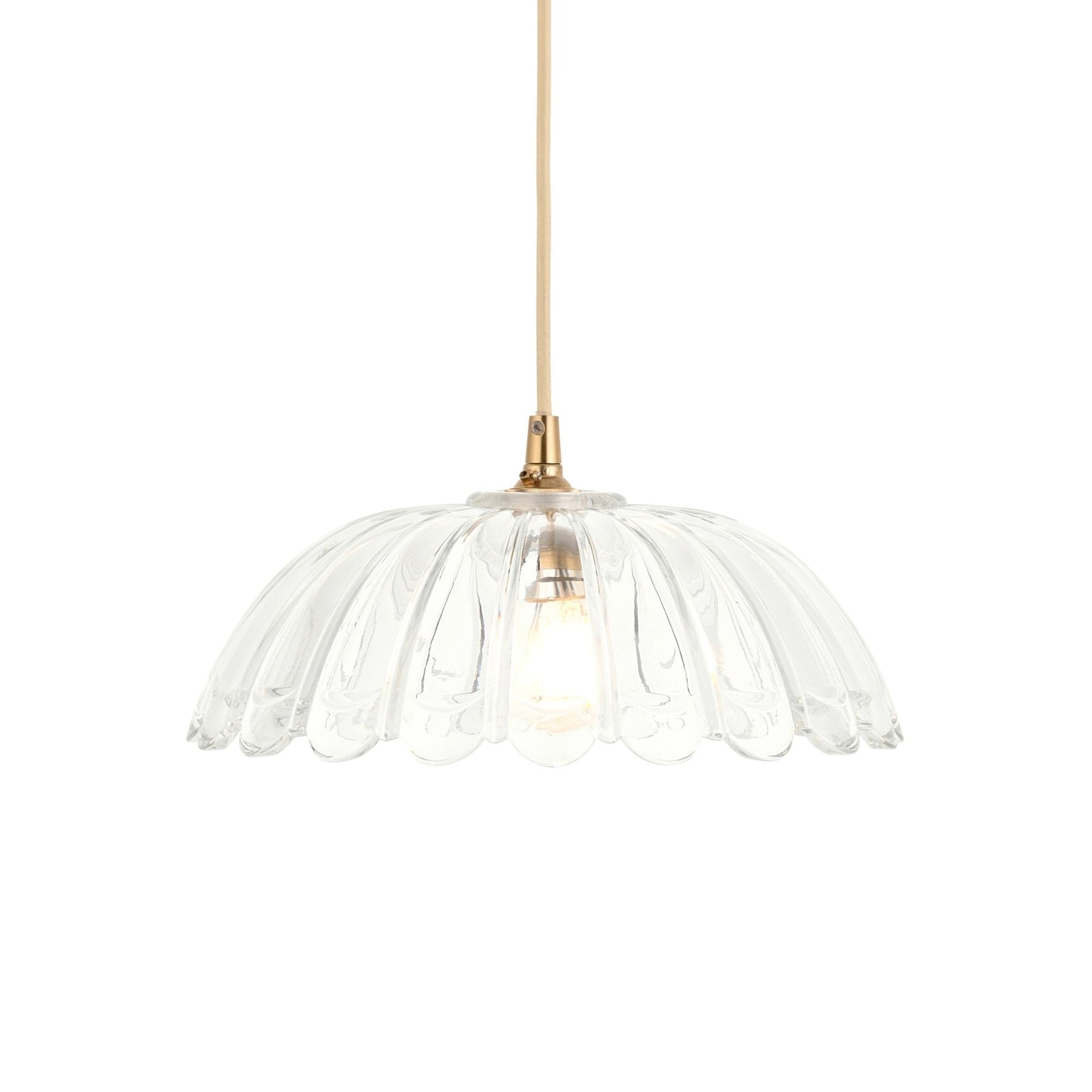 Elegant and timeless, this decorative heavy clear glass shade takes inspiration from classic French design, featuring a gentle dome scalloped form that diffuses light beautifully while adding artistic charm. Crafted with quality and detail in mind, it pairs perfectly with one of our classically styled braided fabric flex sets, allowing you to create a custom pendant that brings vintage sophistication to any room. Ideal for kitchens, hallways, or bedrooms.