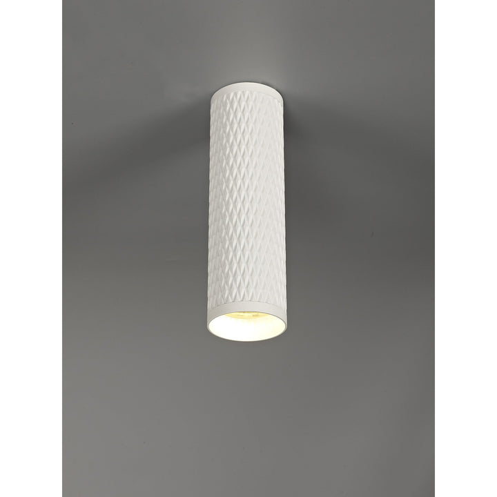 The cylindrical format of the Silence range is decorated with a diamond imprint producing a mesh like effect. These light fittings are available as a surface mounted ceiling fitting, wall lamps, track spotlight or surface mounted adjustable spotlight. The wide variety of colour finishes available, complementing face ring accessories and the pendant kit offers a greater number of lighting solutions for all kinds of room settings and applications.