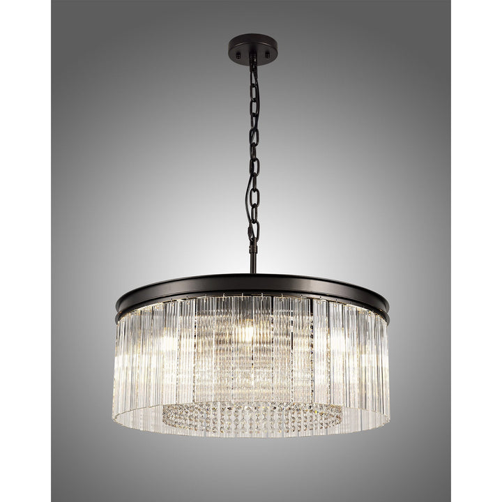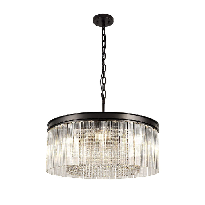 Traditional fittings form this comprehensive collection Baylan, the dark brown oxide colour finish of the framework is a more time-honoured tone for classic lighting styles. The solemn integrity of these models are maintained by the chosen crystal and glass pieces. A tier effect is created by alternating rings of long rectangular glass pieces with a ridged effect and strands of high quality, clear crystals buttons, with the new 3 tier 27 light making an impressive statement.