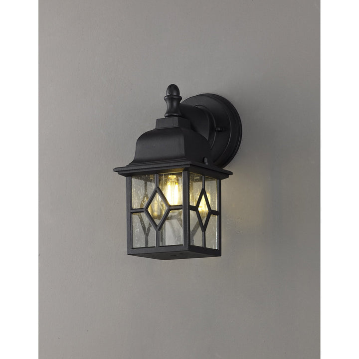 The Guard range features a selection of four different designs of IP44 wall lamps each replicating a classic outdoor lantern motif. The sand black, round and square criss cross pattern are partnered with a clear seeded effect glass which gives the illusion of raindrops within the glass. The round more open framed wall light in antique bronze also features the same glass design with a clearer view of the glass and it’s interior while the grid like framework encircles a clear glass around the E27 lamp holder.