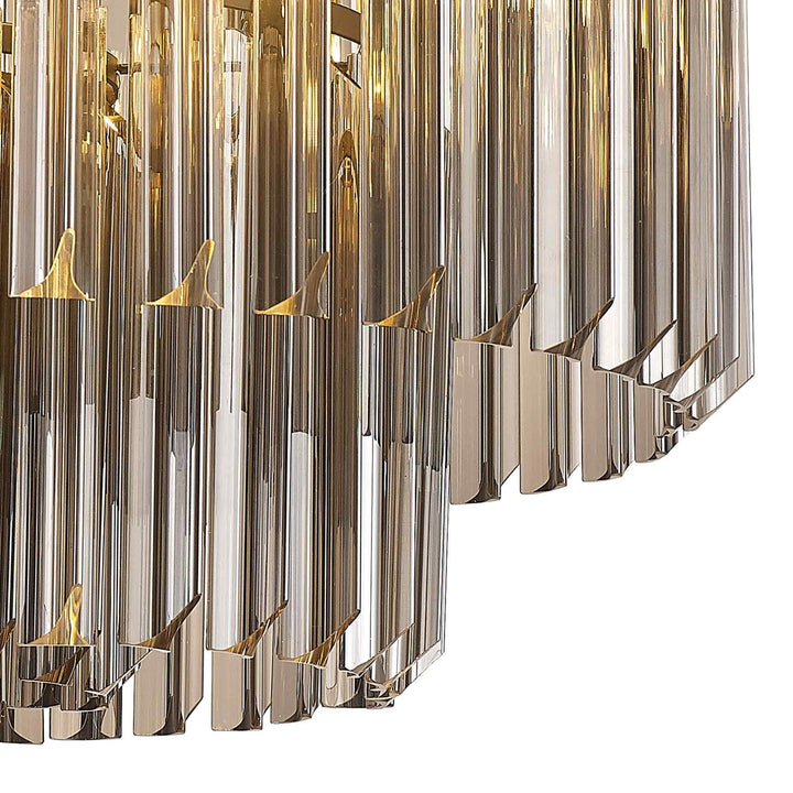 The popularity of the Vienna collections initial release has been so overwhelming that the collection has now been extensively expanded to meet a wider range of specification needs. This contemporary design which originally combined a traditional brass finish with clear sculptured glass pieces, now offers a polished nickel or matt black finish with either clear, cognac or smoked glass. The long angular shape of the glass which are in a tiered form, can now be found on larger more dramatic designs including a five tier and rectangular pendant to name only a few. Vienna has a traditional regal effect composed with modern materials to create a range suitable for either a modern or more traditional room setting. The unique pyramid forms protruding from the frame provide an intriguing overall shape across this comprehensive collection.