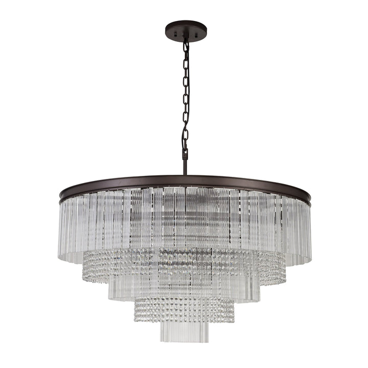 Traditional fittings form this comprehensive collection Baylan, the dark brown oxide colour finish of the framework is a more time-honoured tone for classic lighting styles. The solemn integrity of these models are maintained by the chosen crystal and glass pieces. A tier effect is created by alternating rings of long rectangular glass pieces with a ridged effect and strands of high quality, clear crystals buttons, with the new 3 tier 27 light making an impressive statement.