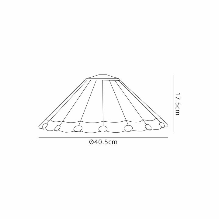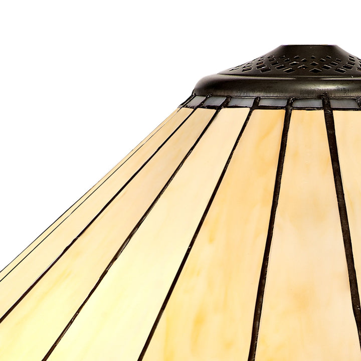 Umbrian uses a traditional Tiffany shade but with a modern twist. The fanned feather shapes forming the umbrella glass is mostly cream coloured with the curved tips of each point available in either green, brown, red, blue or grey. The modern component takes the form of small clear crystal pieces fixed on alternating points of the shades rim furthering the ranges regal appeal.