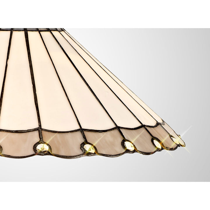 Umbrian uses a traditional Tiffany shade but with a modern twist. The fanned feather shapes forming the umbrella glass is mostly cream coloured with the curved tips of each point available in either green, brown, red, purple or grey. The modern component takes the form of small clear crystal pieces fixed on alternating points of the shades rim furthering the ranges regal appeal.