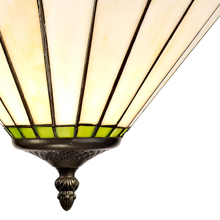 Umbrian uses a traditional Tiffany shade but with a modern twist. The fanned feather shapes forming the umbrella glass is mostly cream coloured with the curved tips of each point available in either green, brown, red, blue or grey. The modern component takes the form of small clear crystal pieces fixed on alternating points of the shades rim furthering the ranges regal appeal. The range of colours gives this products such a large range of settings with the table lamps, floor lamps, pendants and semi ceiling pendants