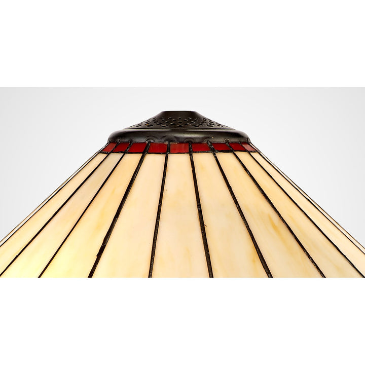 Umbrian uses a traditional Tiffany shade but with a modern twist. The fanned feather shapes forming the umbrella glass is mostly cream coloured with the curved tips of each point available in either green, brown, red, purple or grey. The modern component takes the form of small clear crystal pieces fixed on alternating points of the shades rim furthering the ranges regal appeal.