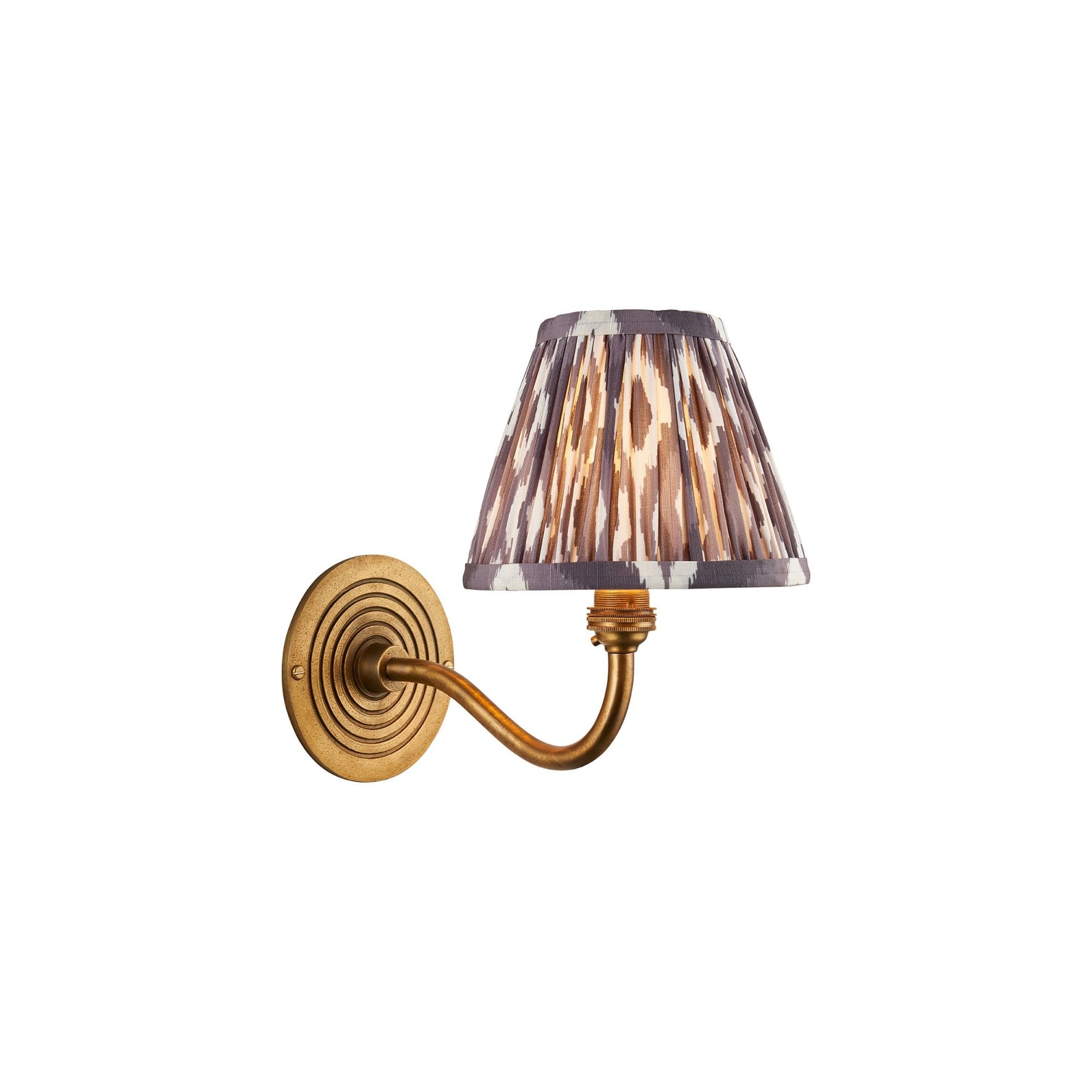 Add a burst of colour and character to your interior with this single B22 wall light, featuring a beautifully sand cast, decorative circular backplate and gracefully curved arm in a warm antique finish. The pleated tapered fabric shade is adorned with a vibrant Ikat pattern in pearl grey, offering a playful yet refined accent. Perfect for bringing a touch of artisan charm to classic or eclectic interiors.