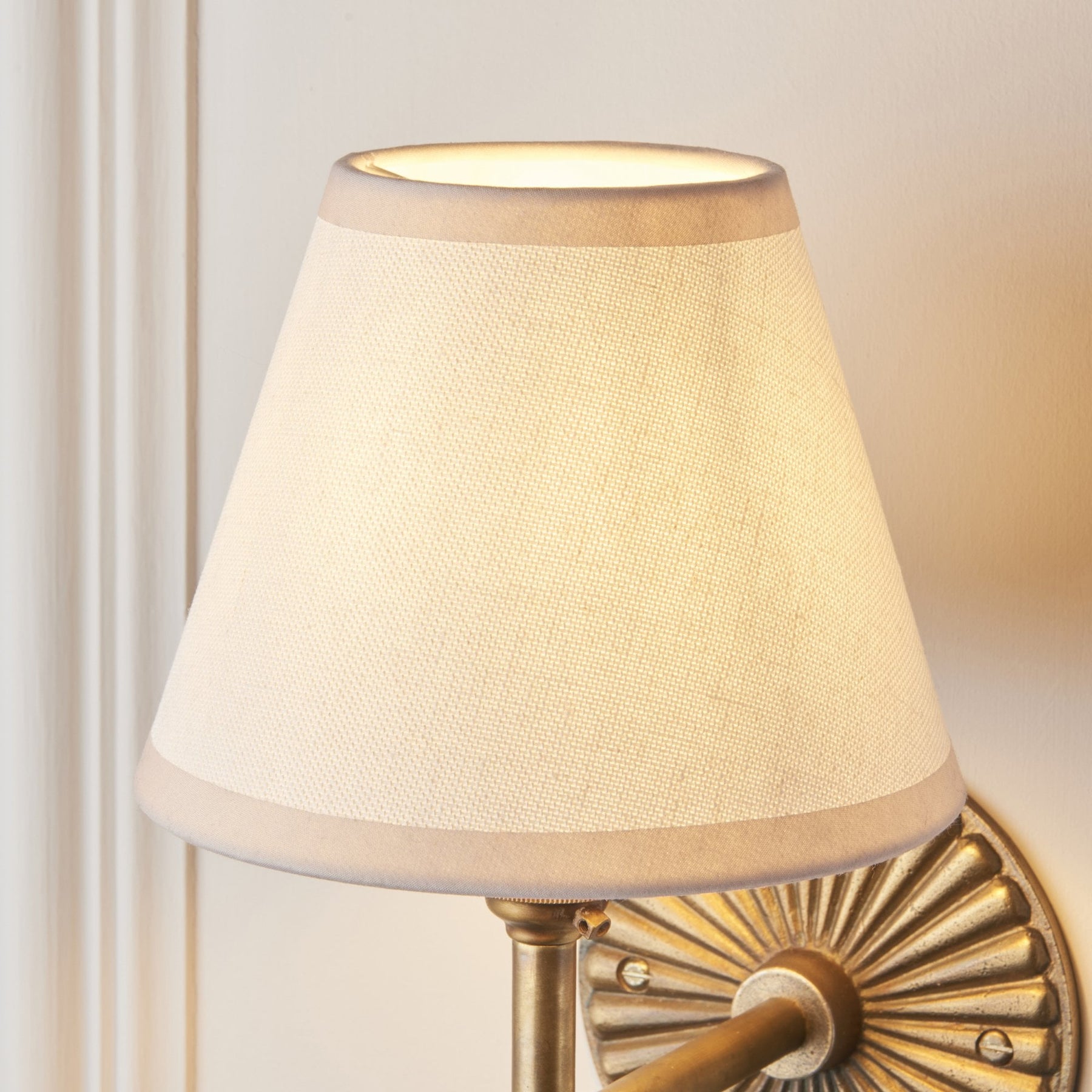 Classic in form and rich in character, this single B22 wall light features a beautifully sand-cast decorative backplate with a fan-fluted design that adds texture and vintage charm. The arm extends to support a tapered fabric shade with contrast colour edging, softly diffusing light to create a warm, inviting glow. Perfect for bedrooms, hallways, or living spaces, this piece blends artisan craftsmanship with timeless elegance.